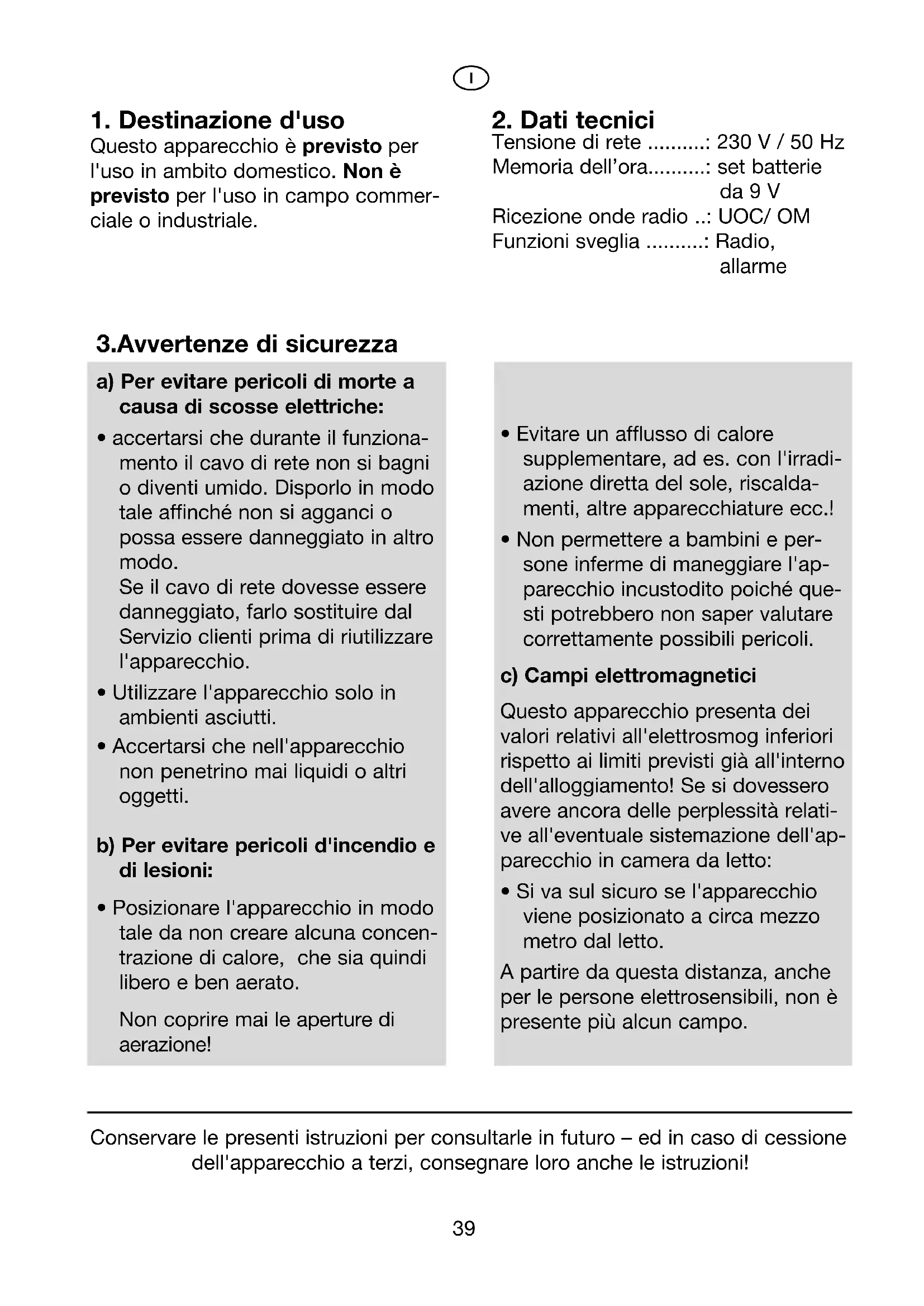 Tensione di rete ..........: 230 V / 50 Hz Memoria dell’ora..........: set batterie da 9 V Ricezione onde radio ..: UOC/ OM Funzioni sveglia ..........: Radio, allarme Conservare le presenti istruzioni per consultarle in futuro – ed in caso di cessione dell'apparecchio a terzi, consegnare loro anche le istruzioni!