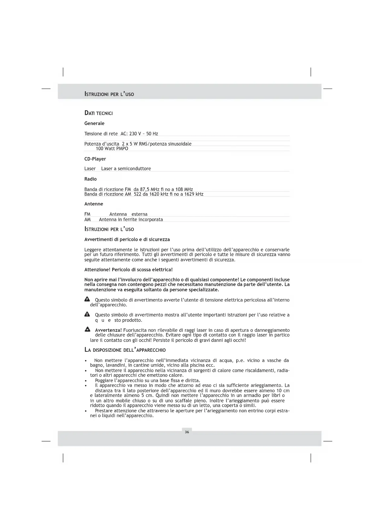 DATI TECNICI Generale Tensione di rete AC: 230 V ~ 50 Hz Potenza d’uscita 2 x 5 W RMS/potenza sinusoidale 100 Watt PMPO CD-Player Laser Laser a semiconduttore Radio Banda di ricezione FM da 87,5 MHz fi no a 108 MHz Banda di ricezione AM 522 da 1620 kHz fi no a 1629 kHz Antenne FM Antenna esterna AM Antenna in ferrite incorporata