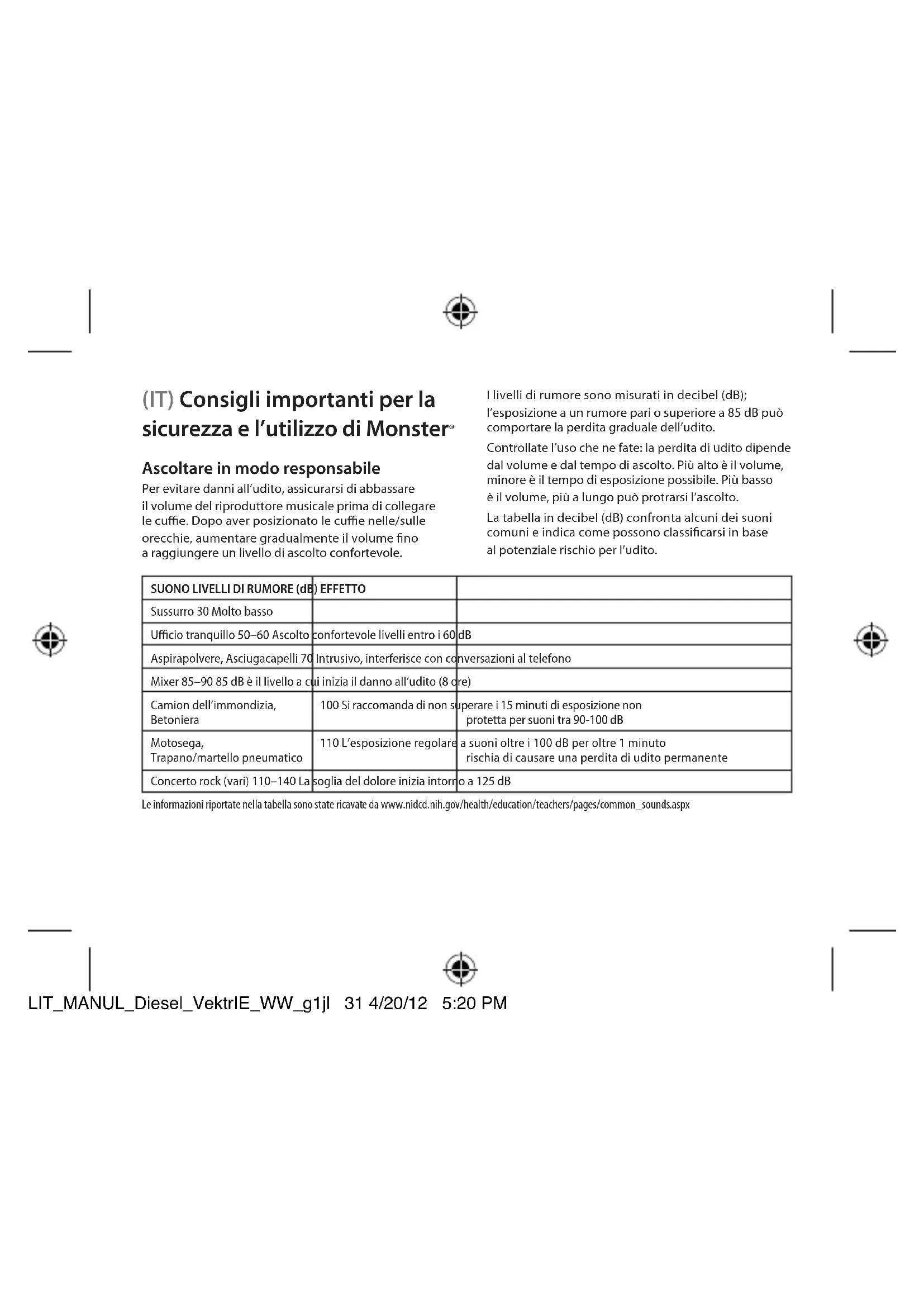 Per ulteriori informazioni sull'effetto dei rumori forti sull'orecchio e la tabella fare riferimento a www.abelard.org/hear/hear.php#loud-music