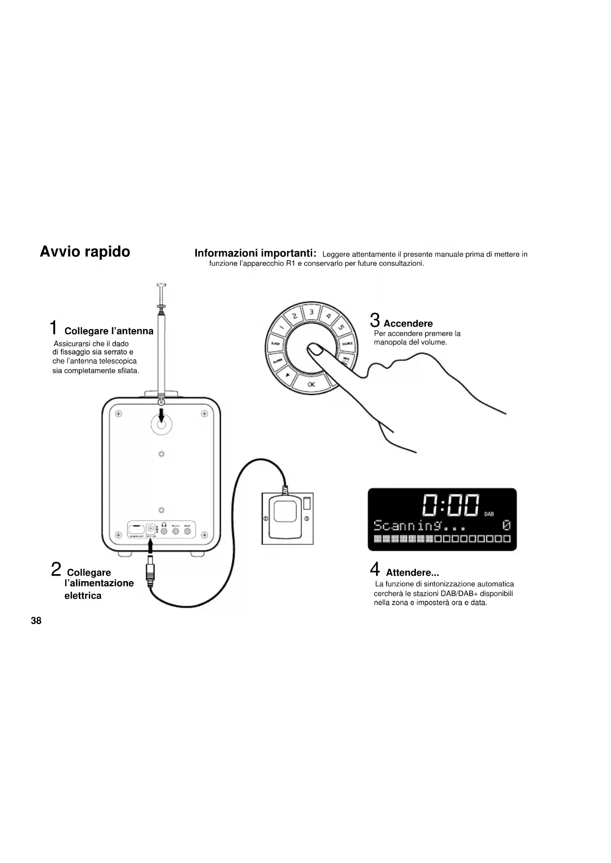 NL38 Avvio rapido 1 Collegare l’antenna Assicurarsi che il dado di ssaggio sia serrato e che l’antenna telescopica sia completamente slata. 2 Collegare l’alimentazione elettrica 3 Accendere Per accendere premere la manopola del volume. 4 Attendere... La funzione di sintonizzazione automatica cercherà le stazioni DAB/DAB+ disponibili nella zona e imposterà ora e data. Informazioni importanti: Leggere attentamente il presente manuale prima di mettere in funzione l’apparecchio R1 e conservarlo per future consultazioni.39 Regolazioni di base “Mantenere premuto” sottintende per almeno 2 secondi. Standby – Premere per accendere/spegnere. Volume – Ruotare a sinistra o a destra. Snooze – Quando suona la sveglia, premere per rinviarla di 5 minuti. Spegnere la sveglia – Mantenere premuto per spegnere la sveglia mentre suona. Preimpostazione radio È possibile memorizzare 5 stazioni DAB e 5 stazioni FM. Per selezionare una stazione già memorizzata premere il corrispondente pulsante numerato. Per memorizzare la stazione su cui si è sintonizzati mantenere premuto uno dei pulsanti numerati. Sorgente Premere SOURCE per scegliere tra DAB, FM e AUX; la sorgente prescelta viene automaticamente caricata. Sleep Impostare il timer ‘sleep’ per porre automaticamente l’R1 in modalità standby. Premere il pulsante SLEEP per scegliere tra 15, 30, 45, 60, 90 minuti, oppure spento. Premere OK per confermare. Se il timer ‘sleep’ è attivo, premendo il pulsante SLEEP viene visualizzato il tempo rimanente. Il simbolo del’orologio sul display mostra che il timer ‘sleep’ è attivo. Info Premere INFO/MENU per scorrere le informazioni relative alla stazione: ad esempio testo, data e ora, tipo di contenuto, ecc. Scelta della stazione DAB: premere ▼▲ per scorrere l’elenco delle stazioni. Premere OK per selezionarne una. FM: mantenere premuto ▼▲ per localizzare la successiva stazione disponibile. FM, sintonizzazione manuale: premere ▼▲ per variare la frequenza. Sveglia Vedi pag. 42 per informazioni dettagliate sull’uso della sveglia. IT40
