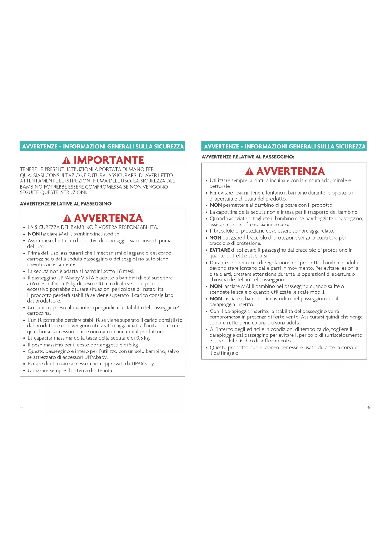 - Il prodotto è danneggiato a causa di un incidente o durante il trasporto, compagnie aeree incluse. UPPAbaby si riserva il diritto di determinare se i termini e le condizioni di garanzia siano stati soddisfatti. In caso di dubbi sulla garanzia, contattare il distributore locale. Registra il tuo passeggino online su uppababy.com. GARANZIA LIMITATA SERVIZIO CLIENTI PAESE CONTATTO TELEFONO SITO INTERNETSTATI UNITIMonahan Products, 60 Sharp Street Hingham, MA 020431.844.823.3132 uppababy.comITALIAHaltho AG Rorschacherstrasse 15, Rheineck CH-9424, Switzerland+41 79 472 64 64 uppababy.com WARNHINWEISE + ALLGEMEINE SICHERHEITSINFORMATIONEN WARNHINWEISE ZUM KINDERWAGEN: WARNUNG