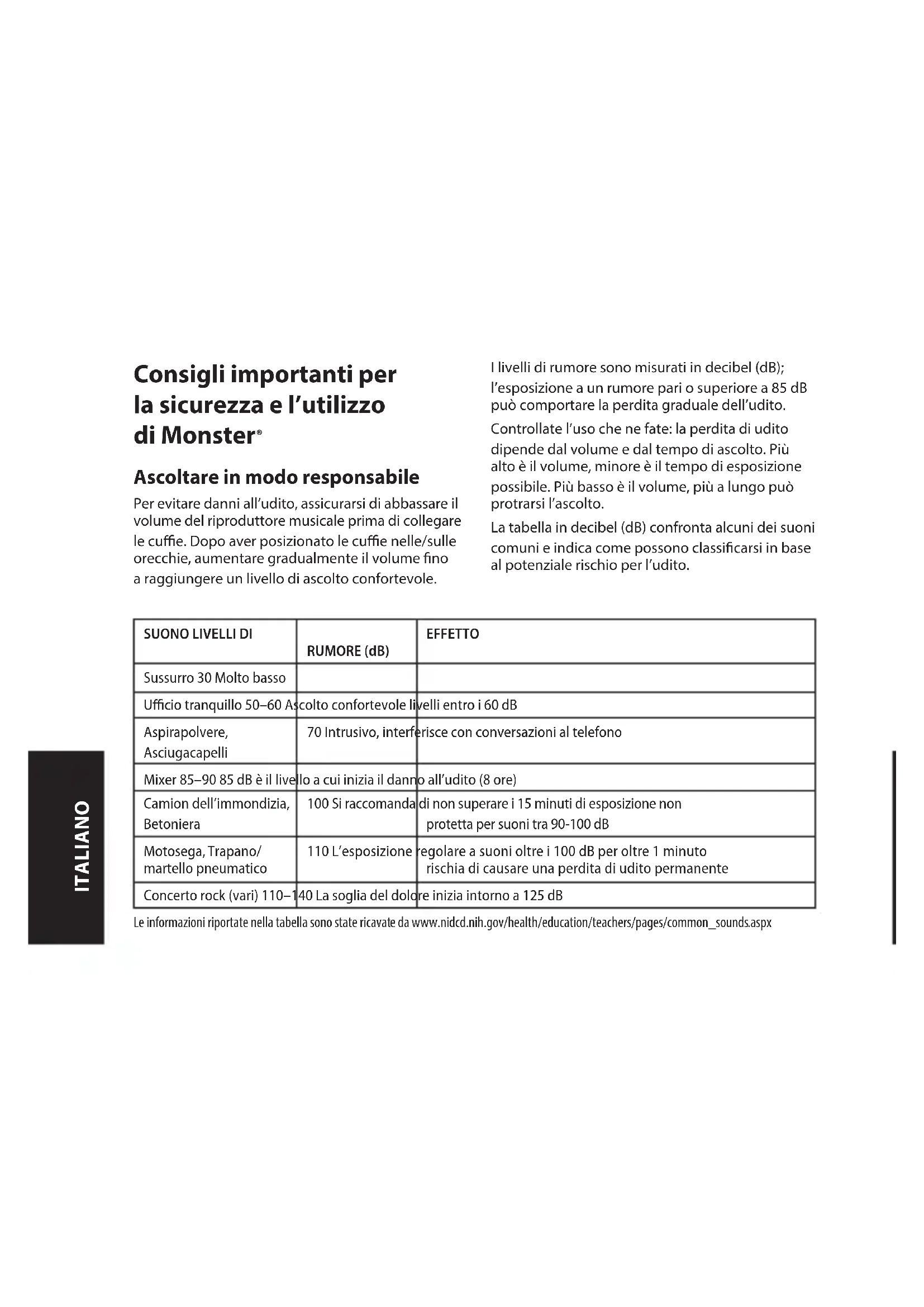 RUMORE (dB) EFFETTO Sussurro 30 Molto basso Ucio tranquillo 50–60 Ascolto confortevole livelli entro i 60 dB Aspirapolvere, Asciugacapelli 70 Intrusivo, interferisce con conversazioni al telefono Mixer 85–90 85 dB è il livello a cui inizia il danno all’udito (8 ore) Camion dell’immondizia, Betoniera 100 Si raccomanda di non superare i 15 minuti di esposizione non protetta per suoni tra 90-100 dB Motosega, Trapano/ martello pneumatico 110 L’esposizione regolare a suoni oltre i 100 dB per oltre 1 minuto rischia di causare una perdita di udito permanente Concerto rock (vari) 110–140 La soglia del dolore inizia intorno a 125 dB Le informazioni riportate nella tabella sono state ricavate da www.nidcd.nih.gov/health/education/teachers/pages/common_sounds.aspx ITALIANOOttieni il massimo dai tuoi dispositivi e godi di un audio eccezionale anche a livelli sicuri. Le nostre cue permettono di percepire maggiori dettagli a volumi più bassi rispetto al passato. Per imparare a comprendere quali sono i livelli di ascolto sicuro ed esaminare altre importanti linee guida della Consumer Electronics Association visitate www.ce.org. Informazioni importanti sulla prevenzione della sordità da rumore e un elenco completo dei rumori che possono causare danni sono disponibili sul sito Web della Deafness Research Foundation, www.drf.org. Fisiologia dell’orecchio e udito For additional information on what loud noises do to your ear and more on protecting the ear, reference www.abelard.org/hear/hear. php#loud-music Utilizzare in modo responsabile Non utilizzare cue quando ciò non è un comportamento sicuro: durante la guida di un veicolo, si va in bicicletta, l’attraversamento di strade, oppure durante attività o in ambienti dove è necessario prestare completa attenzione all’ambiente circostante. È pericoloso guidare quando si indossano cue audio, e in molti posti è anche illegale in quanto ciò riduce le possibilità di udire suoni essenziali per la propria incolumità provenienti dall’esterno dell’abitacolo, come il clacson di un altro veicolo o le sirene dei veicoli di emergenza. Evitare di indossare cue audio durante la guida. Utilizzare invece uno dei trasmettitori FM di Monster per ascoltare i propri dispositivi portatili. “Rodaggio” delle cue Periodo di rodaggio per le cue? Scherziamo, vero? No, non scherziamo aatto! Qualsiasi prodotto ad alte prestazioni, sia che parliamo di automobili che di cue, è un dispositivo meccanico che si stabilizza con l’uso. Le vostre nuove cue avranno un suono incredibile appena tolte dalla confezione, ma si “ammorbidiranno” con l’uso, orendo sonorità ancora migliori. Raccomandiamo pertanto di usarle per almeno 8 ore. Dopo 20 ore di ascolto, dovrebbero essere completamente rodate. Buon divertimento. Incudine Nervo cocleare Staa Membrana timpanica Canale uditivo Coclea Vestibolo Al naso/gola Martello ITALIANOBatteria Se applicabile, le batterie devono essere riciclate o smaltite correttamente. Informazioni al consumatore in applicazione della Direttiva UE WEEE 96/2002 Questo prodotto è soggetto alla regolamentazione europea che promuove il recupero ed il riciclo di apparecchi elettrici ed elettronici usati. Questo prodotto richiede l’estrazione e l’impiego di risorse naturali e può contenere sostanze pericolose. Il simbolo sopra, posto sul prodotto stesso o sull’imballaggio, indica che il prodotto non può essere gettato assieme agli altri riuti comuni. Al contrario, è responsabilità del consumatore eliminare il prodotto consegnandolo ad un punto di raccolta designato per il riciclo di apparecchi elettrici ed elettronici. La raccolta separata ed il riciclo di questo riuto elettrico, al momento della raccolta, aiuterà a conservare le risorse naturali e ad assicurare un corretto riciclo, al ne di preservare la salute umana e l’ambiente. Per maggiori informazioni circa dove consegnare i riuti elettrici ai ni del riciclo, si prega di contattare l’ucio della propria città, il servizio di gestione di riuti, o il negozio dove si è acquistato il prodotto. Per maggiori informazioni sui prodotti Monster, si prega di visitare il sito: www.MonsterProducts.com. Assistenza Monster