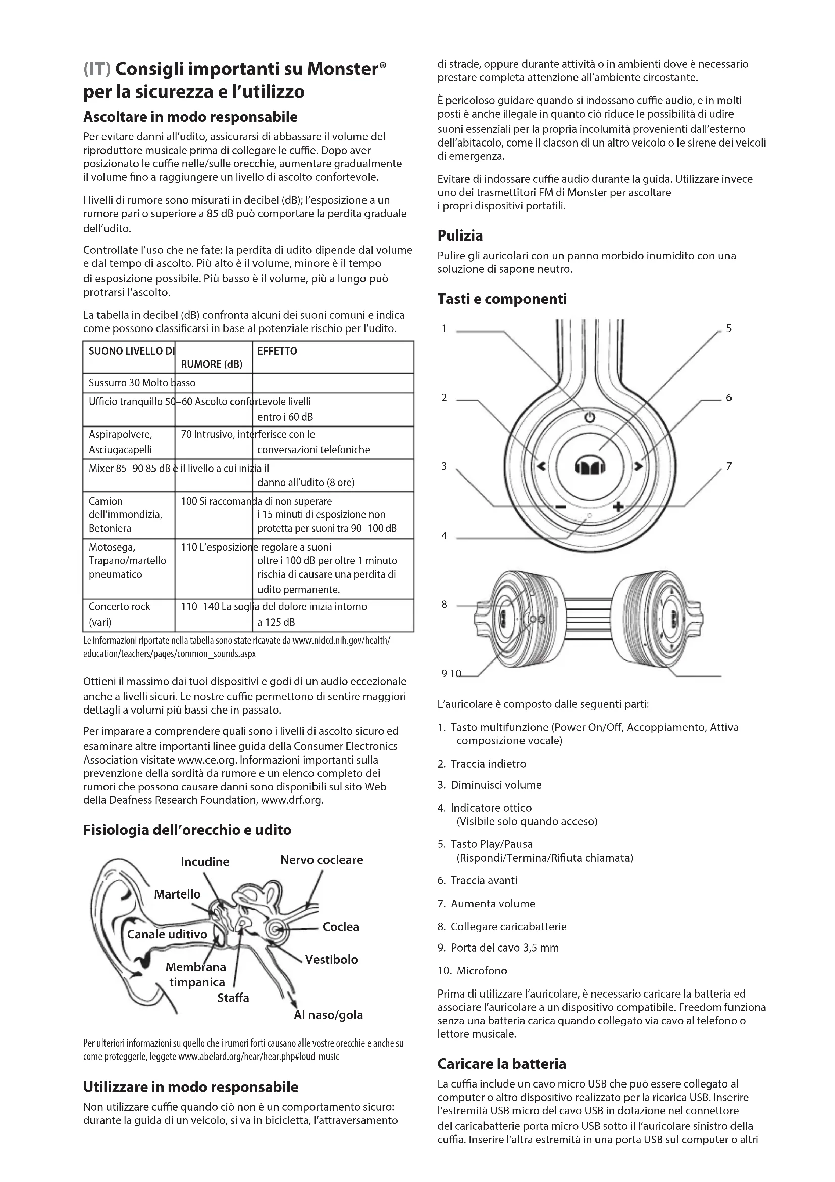 - Nuestros artículos vienen con garantías que no pueden excluirse de acuerdo con la ley australiana del consumidor. Tiene derecho a la sustitución o reembolso por defectos graves y a la compensación por cualquier otra pérdida o daño razonablemente previsibles. También tiene derecho a la reparación o sustitución de los artículos en caso de que los mismos no tengan una calidad aceptable y el fallo no constituya un fallo grave. Ver.121912 – GLOBAL ©2003–2015 Monster, LLC(IT) Consigli importanti su Monster® per la sicurezza e l’utilizzo Ascoltare in modo responsabile Per evitare danni all’udito, assicurarsi di abbassare il volume del riproduttore musicale prima di collegare le cue. Dopo aver posizionato le cue nelle/sulle orecchie, aumentare gradualmente il volume no a raggiungere un livello di ascolto confortevole. I livelli di rumore sono misurati in decibel (dB); l’esposizione a un rumore pari o superiore a 85 dB può comportare la perdita graduale dell’udito. Controllate l’uso che ne fate: la perdita di udito dipende dal volume e dal tempo di ascolto. Più alto è il volume, minore è il tempo di esposizione possibile. Più basso è il volume, più a lungo può protrarsi l’ascolto. La tabella in decibel (dB) confronta alcuni dei suoni comuni e indica come possono classicarsi in base al potenziale rischio per l’udito. Ottieni il massimo dai tuoi dispositivi e godi di un audio eccezionale anche a livelli sicuri. Le nostre cue permettono di sentire maggiori dettagli a volumi più bassi che in passato. Per imparare a comprendere quali sono i livelli di ascolto sicuro ed esaminare altre importanti linee guida della Consumer Electronics Association visitate www.ce.org. Informazioni importanti sulla prevenzione della sordità da rumore e un elenco completo dei rumori che possono causare danni sono disponibili sul sito Web della Deafness Research Foundation, www.drf.org. Fisiologia dell’orecchio e udito Per ulteriori informazioni su quello che i rumori forti causano alle vostre orecchie e anche su come proteggerle, leggete www.abelard.org/hear/hear.php#loud-music Utilizzare in modo responsabile Non utilizzare cue quando ciò non è un comportamento sicuro: durante la guida di un veicolo, si va in bicicletta, l’attraversamento