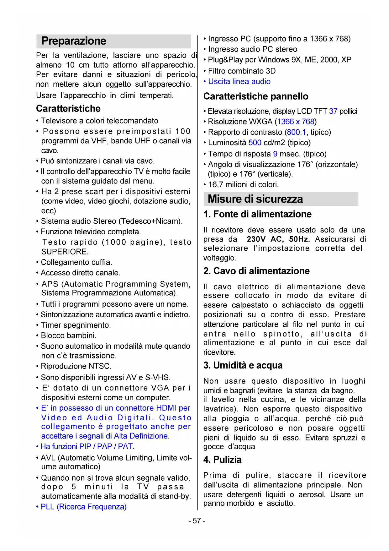 03-ITAL-37700-1072 UK-37 INCH 17MB15 OEM-(LG)-50078226.P65 22.03.2006, 09:3156- 57 - Preparazione Per la ventilazione, lasciare uno spazio di almeno 10 cm tutto attorno allapparecchio. Per evitare danni e situazioni di pericolo, non mettere alcun oggetto sullapparecchio. Usare lapparecchio in climi temperati. Caratteristiche Televisore a colori telecomandato Possono essere preimpostati 100 programmi da VHF, bande UHF o canali via cavo. Può sintonizzare i canali via cavo. Il controllo dellapparecchio TV è molto facile con il sistema guidato dal menu. Ha 2 prese scart per i dispositivi esterni (come video, video giochi, dotazione audio, ecc) Sistema audio Stereo (Tedesco+Nicam). Funzione televideo completa. Testo rapido (1000 pagine), testo SUPERIORE. Collegamento cuffia. Accesso diretto canale. APS (Automatic Programming System, Sistema Programmazione Automatica). Tutti i programmi possono avere un nome. Sintonizzazione automatica avanti e indietro. Timer spegnimento. Blocco bambini. Suono automatico in modalità mute quando non cè trasmissione. Riproduzione NTSC. Sono disponibili ingressi AV e S-VHS. E dotato di un connettore VGA per i dispositivi esterni come un computer. E in possesso di un connettore HDMI per Video ed Audio Digitali. Questo collegamento è progettato anche per accettare i segnali di Alta Definizione. Ha funzioni PIP / PAP / PAT. AVL (Automatic Volume Limiting, Limite vol- ume automatico) Quando non si trova alcun segnale valido, dopo 5 minuti la TV passa automaticamente alla modalità di stand-by. PLL (Ricerca Frequenza) Ingresso PC (supporto fino a 1366 x 768) Ingresso audio PC stereo Plug&Play per Windows 9X, ME, 2000, XP Filtro combinato 3D Uscita linea audio Caratteristiche pannello Elevata risoluzione, display LCD TFT 37 pollici Risoluzione WXGA (1366 x 768) Rapporto di contrasto (800:1, tipico) Luminosità 500 cd/m2 (tipico) Tempo di risposta 9 msec. (tipico) Angolo di visualizzazione 176° (orizzontale) (tipico) e 176° (verticale). 16,7 milioni di colori. Misure di sicurezza