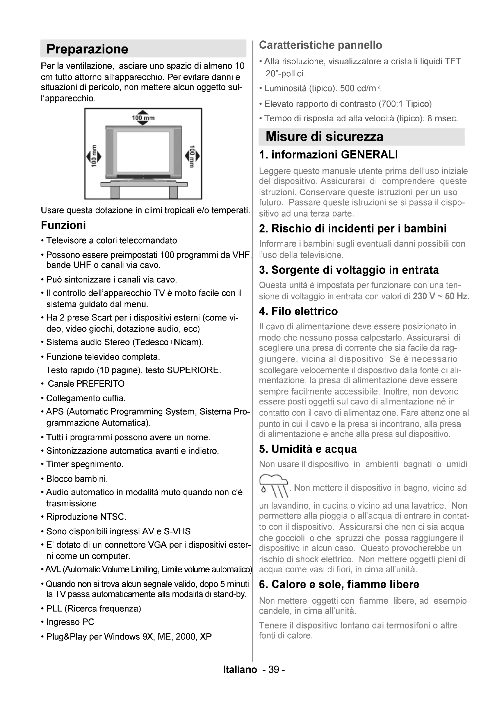 Non mettere oggetti con fiamme libere, ad esempio candele, in cima allunità. Tenere il dispositivo lontano dai termosifoni o altre fonti di calore. Preparazione Per la ventilazione, lasciare uno spazio di almeno 10 cm tutto attorno allapparecchio. Per evitare danni e situazioni di pericolo, non mettere alcun oggetto sul- lapparecchio. Usare questa dotazione in climi tropicali e/o temperati. Funzioni Televisore a colori telecomandato Possono essere preimpostati 100 programmi da VHF, bande UHF o canali via cavo. Può sintonizzare i canali via cavo. Il controllo dellapparecchio TV è molto facile con il sistema guidato dal menu. Ha 2 prese Scart per i dispositivi esterni (come vi- deo, video giochi, dotazione audio, ecc) Sistema audio Stereo (Tedesco+Nicam). Funzione televideo completa. Testo rapido (10 pagine), testo SUPERIORE. Canale PREFERITO Collegamento cuffia. APS (Automatic Programming System, Sistema Pro- grammazione Automatica). Tutti i programmi possono avere un nome. Sintonizzazione automatica avanti e indietro. Timer spegnimento. Blocco bambini. Audio automatico in modalità muto quando non cè trasmissione. Riproduzione NTSC. Sono disponibili ingressi AV e S-VHS. E dotato di un connettore VGA per i dispositivi ester- ni come un computer. AVL (Automatic Volume Limiting, Limite volume automatico) Quando non si trova alcun segnale valido, dopo 5 minuti la TV passa automaticamente alla modalità di stand-by. PLL (Ricerca frequenza) Ingresso PC Plug&Play per Windows 9X, ME, 2000, XP 03-ITAL-2011-1243UK-17MB24-(HP LINE OUT)(YPbPr)-50095833.P65 16.11.2006, 15:1539Italiano - 40 - Evitare la luce diretta del sole.