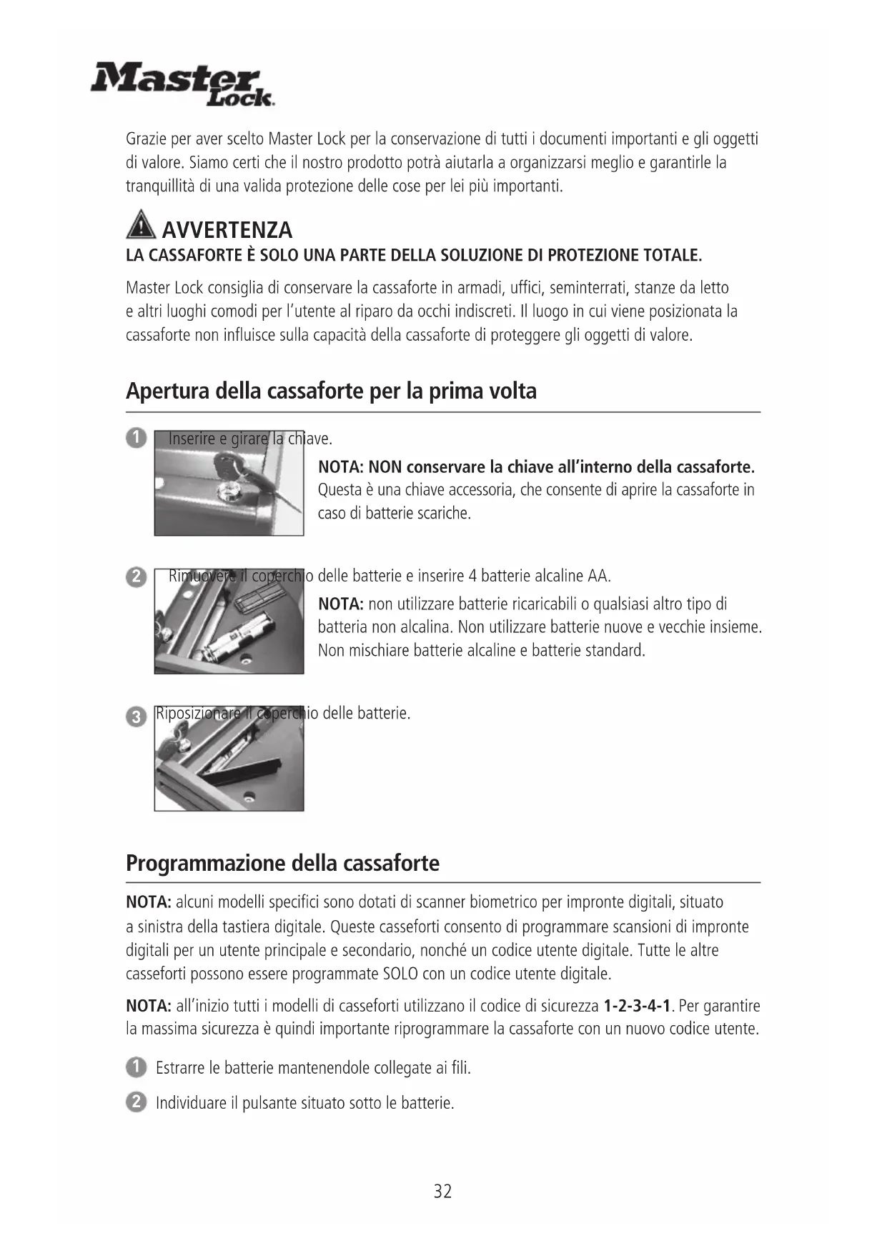 Grazie per aver scelto Master Lock per la conservazione di tutti i documenti importanti e gli oggetti di valore. Siamo certi che il nostro prodotto potrà aiutarla a organizzarsi meglio e garantirle la tranquillità di una valida protezione delle cose per lei più importanti.