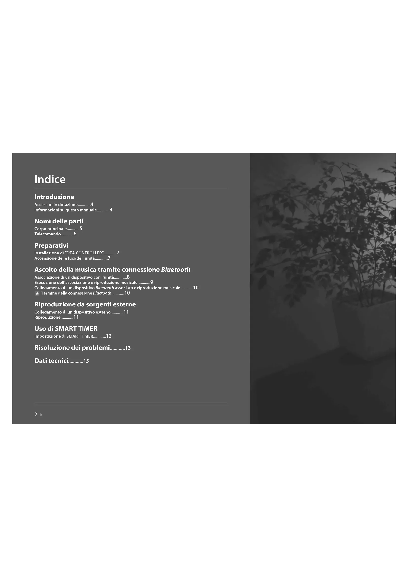 - Yamaha garanterar inte att alla trådlösa anslutningar mellan den här enheten och enheter kompatibla med Bluetooth-funktionen. © 2013 CSR plc och dess koncernsföretag. aptX®-märket och aptX-logotypen är varumärken som tillhör CSR plc eller ett av dess gruppföretag och kan vara registrerat i ett eller flera jurisdiktioner. Android™ Android och Google Play är varumärken som tillhör Google, Inc. Bluetooth Bluetooth-version Ver. 2.1+EDR Kompatibel profil A2DP (Advanced Audio Distribution Profile) Kompatibla codecs SBC, AAC, aptX® Trådlös utgång Bluetooth Klass 2 Max. kommunikationsavstånd 10 m (utan hinder) AUX IN sektion Ingångskontakt 3,5 mm stereominijack Belysning (LED*) Livstid (Ljusflöde under 70 %) Cirka 36 000 timmar Effektförbrukning (När enbart belysningen är på) 7 W Allmänt Strömförsörjning AC 230 V, 50 Hz Effektförbrukning Vid påslagen ström (musiken spelas upp och belysningen är på): 15 W Vid avslagen ström (belysningen och SMART TIMER är av och ingen Bluetooth-anslutning): 0,2 W Standbyförhållande (SMART TIMER är på) eller Bluetooth- standby: 0,6 W Mått (B × H × D) 271 × 290 × 271 mm Vikt 3,3 kg2 It Indice Introduzione Accessori in dotazione............4 Informazioni su questo manuale............4 Nomi delle parti Corpo principale............5 Telecomando............6 Preparativi Installazione di “DTA CONTROLLER”............7 Accensione delle luci/dell’unità............7 Ascolto della musica tramite connessione Bluetooth Associazione di un dispositivo con l’unità............8 Esecuzione dell’associazione e riproduzione musicale............9 Collegamento di un dispositivo Bluetooth associato e riproduzione musicale............10 Termine della connessione Bluetooth............10 Riproduzione da sorgenti esterne Collegamento di un dispositivo esterno............11 Riproduzione............11 Uso di SMART TIMER Impostazione di SMART TIMER............12 Risoluzione dei problemi............13 Dati tecnici............15It 3 Italiano Audio di qualità e semplicità d’uso La comodità del sistema “Plug and play” offerta dai dispositivi mobili con un suono ottimizzato. ..............8, 11 Comodo controllo a distanza dal proprio dispositivo mobile. ............7 Un’armonia di musica e luci Inizia la tua giornata nel modo migliore: lascia che sia la tua musica preferita a svegliarti piacevolmente. ............12 A fine giornata, immergiti in un’atmosfera rilassante di raffinate melodie e luci soffuse. ............74 It Introduzione Controllare il contenuto della confezione e leggere attentamente il presente manuale. Accessori in dotazione Informazioni su questo manuale