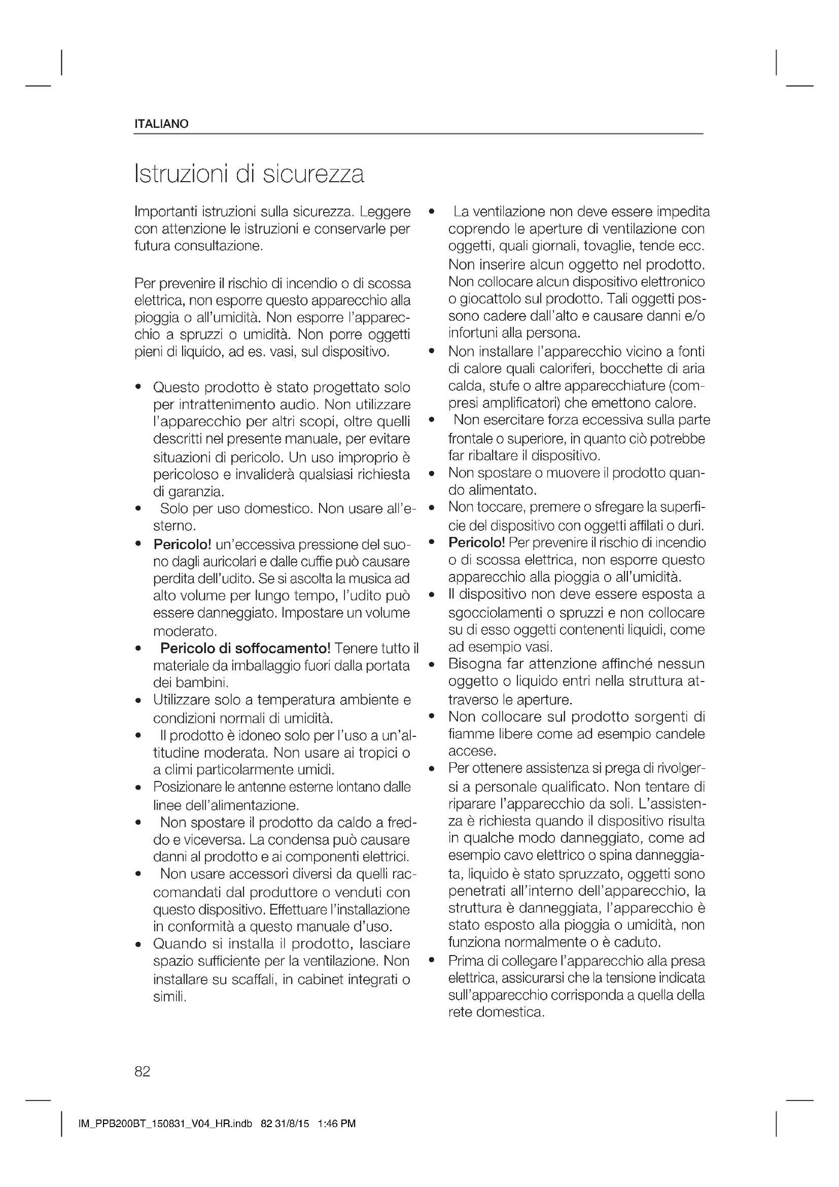 Pulsante Riproduzione/Pausa J. Coperchio K. microSD card slot L. Presa AUX-IN M. Ingresso USB N. Pulsante RESET O. Presa DC-IN Accessori 1 x radio FM e altoparlante Bluetooth® 1 x adattatore di alimentazione con cavo e spina DC 1 x cavo AUX-IN 1 x manuale d’uso Unità principale IM_PPB200BT_150831_V04_HR.indb 84 31/8/15 1:46 PM85 ITALIANO Leggere con cura questa guida dell’utente per evitare guasti o lesioni a causa di uso im- proprio. Prestare particolare attenzione alle istruzioni di sicurezza. Il prodotto deve essere caricato prima del primo utilizzo. Si prega di fare riferimento al capitolo “Caricamento delle batterie”. Tenere le istruzioni per riferimento futuro e consegnarle se il dispositivo è consegnato a terzi. Rimuovere con cura tutto il materiale di imballaggio e controllare che il dispositivo sia completo e integro. Non usare un dispositivo danneggiato. Alimentazione elettrica