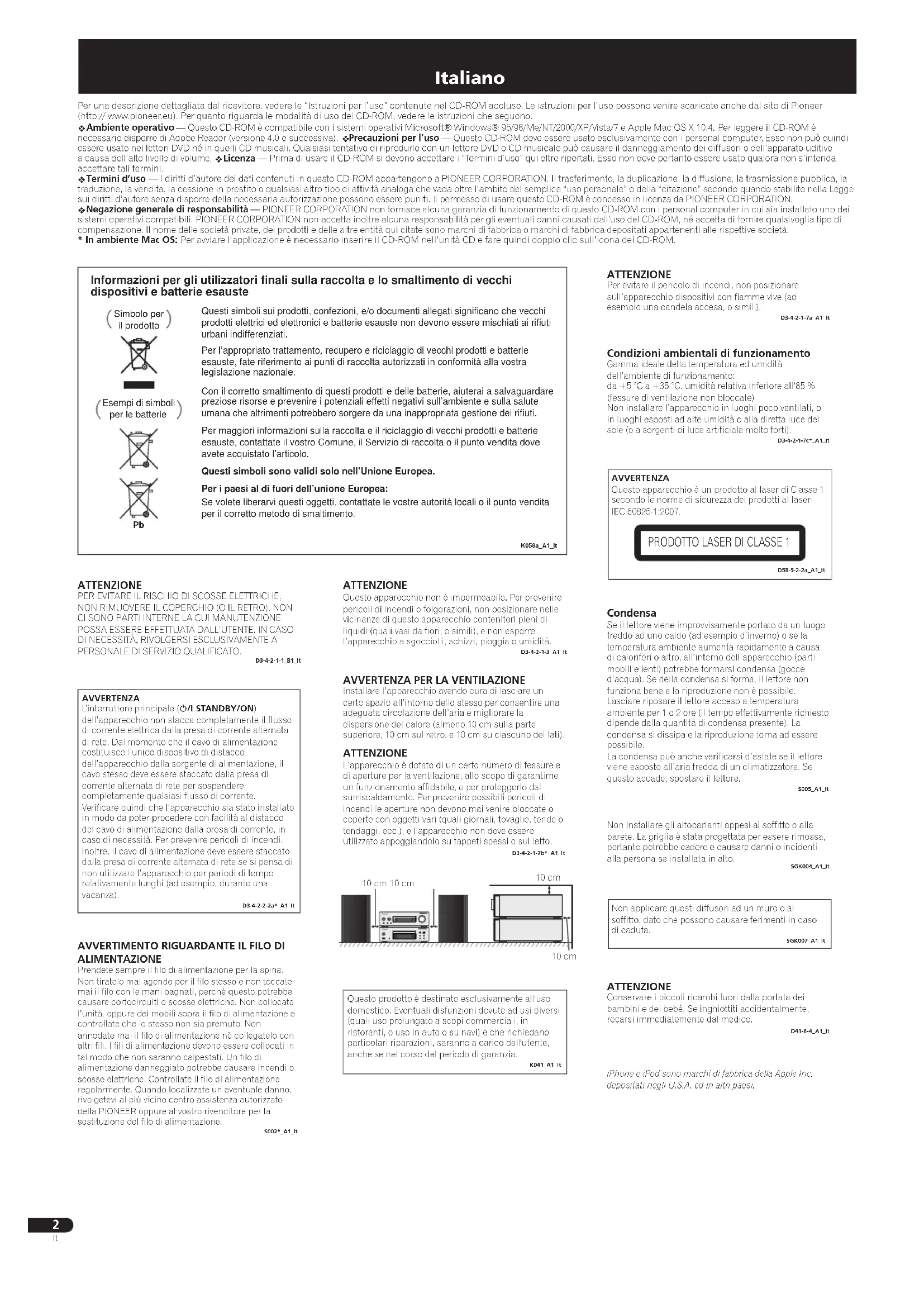 ALIMENTAZIONE Prendete sempre il filo di alimentazione per la spina. Non tiratelo mai agendo per il filo stesso e non toccate mai il filo con le mani bagnati, perchè questo potrebbe causare cortocircuiti o scosse elettriche. Non collocate l’unità, oppure dei mobili sopra il filo di alimentazione e controllate che lo stesso non sia premuto. Non annodate mai il filo di alimentazione nè collegatelo con altri fili. I fili di alimentazione devono essere collocati in tal modo che non saranno calpestati. Un filo di alimentazione danneggiato potrebbe causare incendi o scosse elettriche. Controllate il filo di alimentazione regolarmente. Quando localizzate un eventuale danno, rivolgetevi al più vicino centro assistenza autorizzato della PIONEER oppure al vostro rivenditore per la sostituzione del filo di alimentazione.S002*_A1_ItAVVERTENZAQuesto apparecchio è un prodotto al laser di Classe 1 secondo le norme di sicurezza dei prodotti al laser IEC 60825-1:2007.