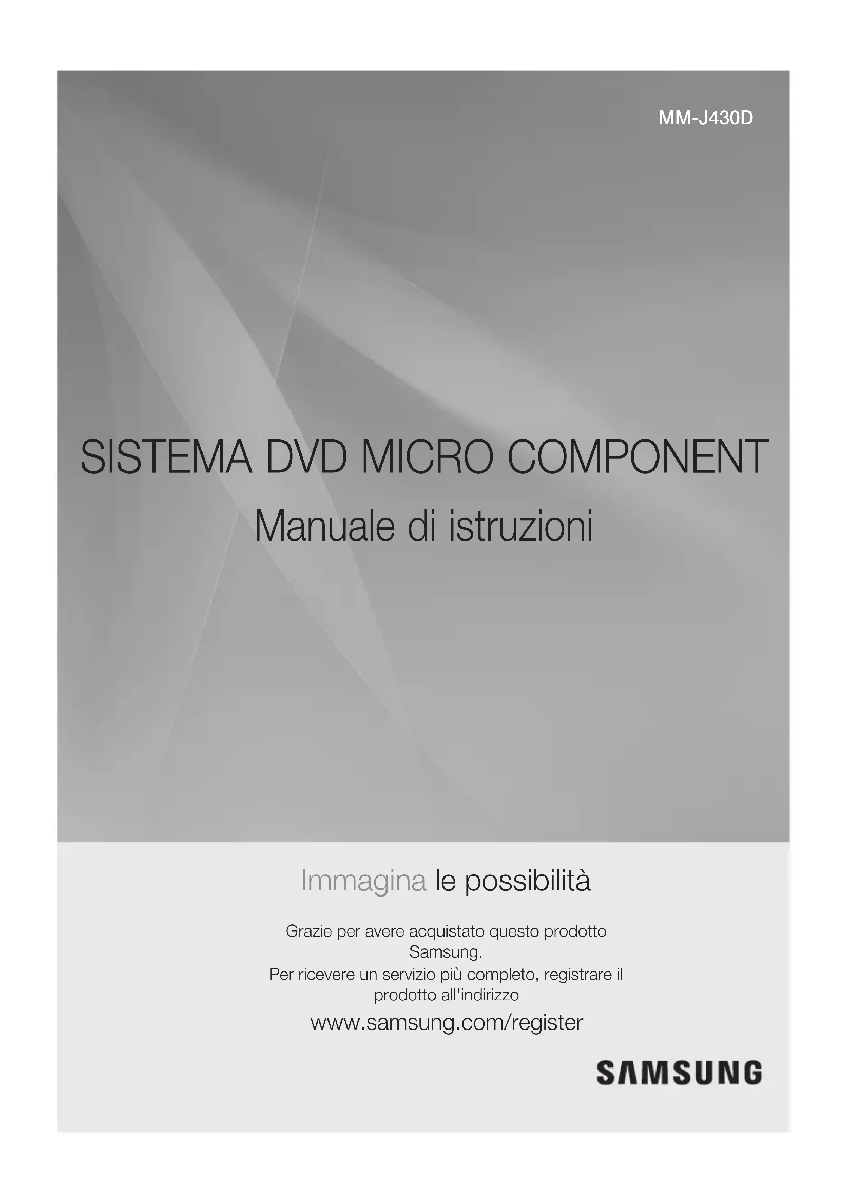 Manuale di istruzioni Immagina le possibilità Grazie per avere acquistato questo prodotto Samsung.Per ricevere un servizio più completo, registrare il prodotto all'indirizzo www.samsung.com/register MM-J430D-EN-ITA-0701.indd 1 2015/7/3 13:51:48| 2 Italiano Informazioni sulla sicurezza Avvertenze per la sicurezza PER RIDURRE IL RISCHIO DI SCOSSE ELETTRICHE, NON RIMUOVERE IL COPERCHIO (O LA PARTE POSTERIORE).ALL'INTERNO NON VI SONO PARTI RIPARABILI DALL'UTENTE. PER LA MANUTENZIONE RIVOLGERSI AL PERSONALE DI ASSISTENZA QUALIFICATO ATTENZIONE RISCHIO DI SCOSSE ELETTRICHENON APRIREQuesto simbolo indica la presenza di "tensione pericolosa" all'interno del prodotto, che comporta il rischio di scosse elettriche o lesioni.ATTENZIONE : PER EVITARE SCOSSE ELETTRICHE, INSERIRE A FONDO LO SPINOTTO PIÙ LARGO DELLA SPINA NELLA RELATIVA PRESA.Questo simbolo indica istruzioni importanti che accompagnano il prodotto.AVVERTENZA