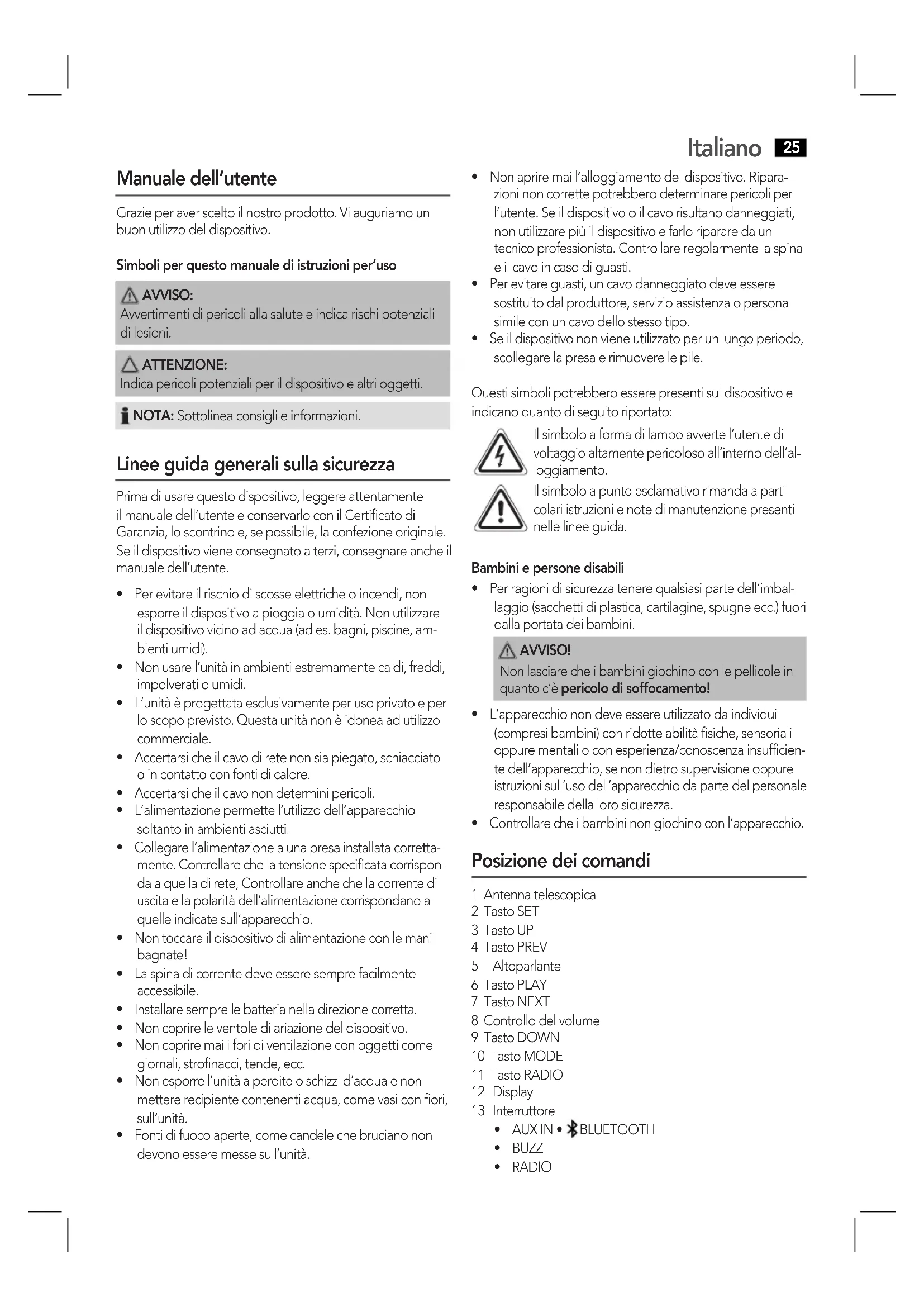 - Seildispositivononvieneutilizzatoperunlungoperiodo, scollegare la presa e rimuovere le pile. Questi simboli potrebbero essere presenti sul dispositivo e indicano quanto di seguito riportato: Il simbolo a forma di lampo avverte l’utente di voltaggio altamente pericoloso all’interno dell’al- loggiamento. Il simbolo a punto esclamativo rimanda a parti- colari istruzioni e note di manutenzione presenti nelle linee guida. Bambini e persone disabili