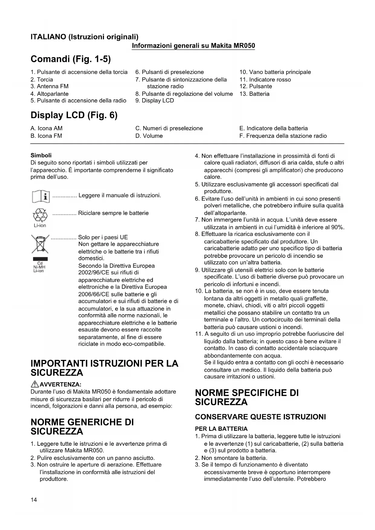 SICUREZZA AVVERTENZA: Durante l’uso di Makita MR050 è fondamentale adottare misure di sicurezza basilari per ridurre il pericolo di incendi, folgorazioni e danni alla persona, ad esempio: