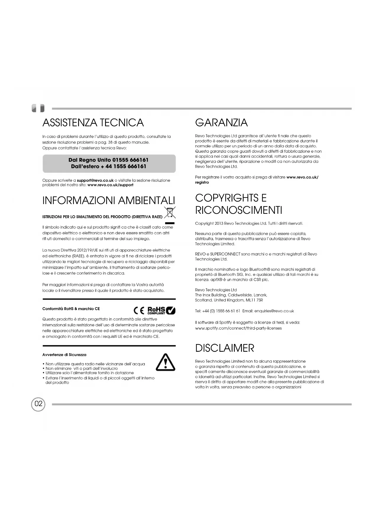 GARANZIA Revo Technologies Ltd garantisce all’utente fi nale che questo prodotto è esente da difetti di materiali e fabbricazione durante il normale utilizzo per un periodo di un anno dalla data di acquisto. Questa garanzia copre guasti dovuti a difetti di fabbricazione e non si applica nei casi quali danni accidentali, rottura o usura generale, negligenza dell’utente, riparazione o modifi ca non autorizzata da Revo Technologies Ltd. Per registrare il vostro acquisto si prega di visitare www.revo.co.uk/ registro COPYRIGHTS E RICONOSCIMENTI Copyright 2013 Revo Technologies Ltd. Tutti I diritti riservati. Nessuna parte di questa pubblicazione può essere copiata, distribuita, trasmessa o trascritta senza l’autorizzazione di Revo Technologies Limited. REVO e SUPERCONNECT sono marchi o e marchi registrati di Revo Technologies Ltd. Il marchio nominativo e logo Bluetooth® sono marchi registrati di proprietà di Bluetooth SIG, Inc. e qualsiasi utilizzo di tali marchi è su licenza. aptX® è un marchio di CSR plc. Revo Technologies Ltd The Inox Building, Caldwellside, Lanark, Scotland, United Kingdom, ML11 7SR Tel: +44 (0) 1555 66 61 61 Email: enquiries@revo.co.uk Il software di Spotify è soggetto a licenze di terzi, si veda: www.spotify.com/connect/third-party-licenses DISCLAIMER Revo Technologies Limited non fa alcuna rappresentazione o garanzia rispetto al contenuto di questa pubblicazione, e specifi camente disconosce eventuali garanzie di commerciabilità o idoneità ad utilizzi particolari. Inoltre, Revo Technologies Limited si riserva il diritto di apportare modifi che alla presente pubblicazione di volta in volta, senza preavviso a persone o organizzazioniCONTENUTI 02 Assistenza Tecnica 02 Informazioni ambientali 02 Garanzia 02 Copyrights e Riconoscimenti 02 Disclaimer 03 Benvenuti / Disimballaggio 04 Panoramica 05 Telecomando 06 Alimentazione 06 Impostazione 07 Comandi e Struttura Menu