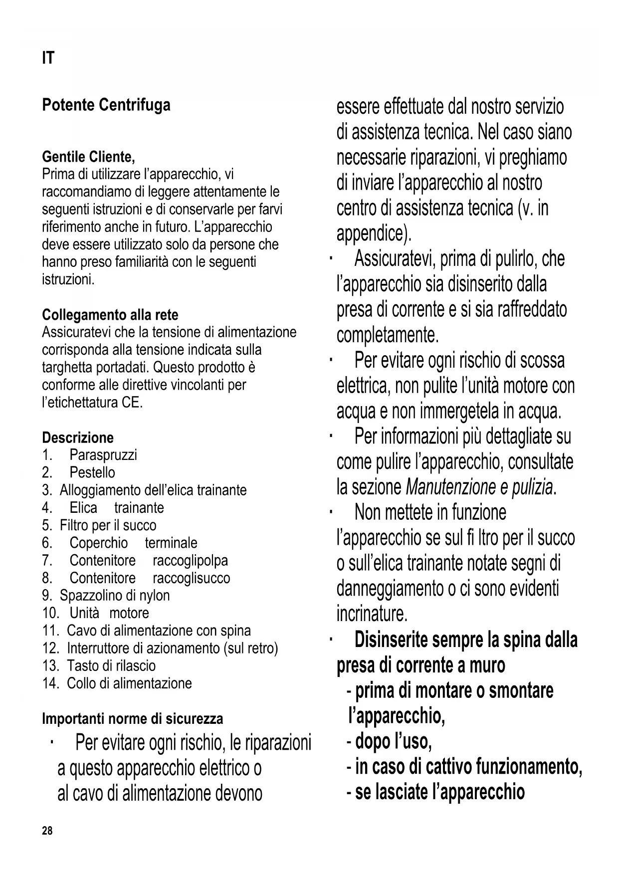 Importanti norme di sicurezza ∙ Per evitare ogni rischio, le riparazioni a questo apparecchio elettrico o al cavo di alimentazione devono essere effettuate dal nostro servizio di assistenza tecnica. Nel caso siano necessarie riparazioni, vi preghiamo di inviare l’apparecchio al nostro centro di assistenza tecnica (v. in appendice). ∙ Assicuratevi, prima di pulirlo, che l’apparecchio sia disinserito dalla presa di corrente e si sia raffreddato completamente. ∙ Per evitare ogni rischio di scossa elettrica, non pulite l’unità motore con acqua e non immergetela in acqua. ∙ Per informazioni più dettagliate su come pulire l’apparecchio, consultate la sezione Manutenzione e pulizia. ∙ Non mettete in funzione l’apparecchio se sul fi ltro per il succo o sull’elica trainante notate segni di danneggiamento o ci sono evidenti incrinature. ∙ Disinserite sempre la spina dalla presa di corrente a muro - prima di montare o smontare l’apparecchio, - dopo l’uso, - in caso di cattivo funzionamento, - se lasciate l’apparecchio IT29 incustodito, - prima di pulire l’apparecchio. ∙ Avvertenza: Il cattivo uso può essere causa di gravi lesioni alla persona. ∙ Questo apparecchio è studiato per il solo uso domestico o per impieghi simili, come per esempio - dal personale di negozi, uffi ci o altri ambienti di lavoro simili, - in aziende agricole, - da clienti di alberghi, motel e sistemazioni simili, - da clienti di pensioni “bed-and- breakfast” (letto & colazione). ∙ L’apparecchio può essere usato anche da persone con ridotte capacità fi siche sensoriali o mentali, a condizione che siano sotto sorveglianza, che siano state date loro istruzioni sull’uso dell’apparecchio e che comprendano pienamente i rischi e le precauzioni di sicurezza che l’apparecchio comporta. ∙ Ai bambini non deve essere consentito l’utilizzo dell’apparecchio. L’apparecchio e il cavo di alimentazione devono essere tenuti fuori della portata dei bambini. ∙ Ai bambini non deve essere consentito di giocare con l’apparecchio. ∙ Avvertenza: Tutto il materiale di imballaggio deve essere tenuto fuori della portata dei bambini a causa del rischio potenziale esistente, per esempio di soffocamento. ∙ Prima di ogni utilizzo dell’apparecchio, controllate attentamente che l’apparecchio e gli accessori inseriti non presentino tracce di deterioramento. Se per esempio fosse caduto battendo su una superfi cie dura, o se è stata usata una forza eccessiva nel tirare il cavo di alimentazione, l’apparecchio non va più usato: danni anche invisibili ad occhio nudo potrebbero comportare conseguenze negative sulla sicurezza nel funzionamento dell’apparecchio. ∙ Non lasciate mai l’apparecchio incustodito quando è collegato all’alimentazione elettrica. ∙ Per sicurezza, usate sempre il pestello per inserire la frutta o gli ortaggi nel collo di alimentazione. Non inserite mai, in nessun caso, mani o dita. ∙ Anche dopo aver spento l’apparecchio, il motorino continua a funzionare ancora per un breve lasso di tempo. Aspettate sempre che si sia arrestato completamente prima di aprire l’apparecchio. ∙ Non lasciate l’apparecchio o il cavo di alimentazione a contatto con superfi ci calde o con una qualsiasi fonte di calore. ∙ Per disinserire la spina dalla presa30 di corrente, non tirate mai il cavo di alimentazione, ma afferrate direttamente la spina. Non lasciate pendere liberamente il cavo di alimentazione. ∙ Nessuna responsabilità verrà assunta in caso di danni risultanti da un uso improprio o dalla non conformità alle istruzioni. Consigli utili per l’estrazione del succo ∙ Quasi tutti i tipi più comuni di frutta sono adatti per l’estrazione del succo, come mele, pere, susine, fragole, uva, arance, melone, kiwi, ananas, mango e papaya. ∙ Per quanto riguarda gli ortaggi, i più adatti all’estrazione del succo sono i seguenti: carote, cavolo rapa, sedano o cetriolo. È comunque possibile estrarre succo anche da spinaci, rucola o diversi tipi di lattuga. ∙ Mele, carote, cetrioli e sedano, inoltre, producono un succo rivitalizzante. ∙ Un gustoso succo per la prima colazione può essere ottenuto con pompelmi, carote e mele. ∙ Le banane non sono adatte all’estrazione di succo, perché ne contengono una quantità molto piccola. ∙ Dopo la pelatura, tagliate a pezzetti la frutta o gli ortaggi e togliete eventuali chicchi, noccioli o semi per evitare di danneggiare l’apparecchio. ∙ Per facilitare l’estrazione del succo, tagliate a pezzi più piccoli i frutti o gli ortaggi più duri come carote, fi nocchio o cavolo rapa. Utilizzo a brevi intervalli Questo apparecchio è studiato per funzionare solo a brevi intervalli, il che signifi ca che non può funzionare per un periodo continuo superiore ai 10 minuti. Lasciate che si raffreddi per altri 10 minuti e solo dopo potete riutilizzare l’apparecchio. Scatto termico di sicurezza L’apparecchio è dotato di un interruttore per lo scatto termico di sicurezza che lo protegge dal surriscaldamento. In caso di innesco dello scatto termico di sicurezza, dovrete aspettare che l’apparecchio si raffreddi completamente prima di accenderlo di nuovo. Primo utilizzo dell’apparecchio Al primo utilizzo dell’apparecchio, lavatelo nel modo indicato nella sezione Manutenzione e pulizia. Interruttore L’apparecchio è dotato di un interruttore di azionamento. 0 apparecchio spento ON funzionamento normale R funzionamento in senso inverso Funzionamento ∙ Inserite l’alloggiamento dell’elica trainante nell’unità motore in modo che il simbolo a freccia sull’alloggiamento dell’elica sia allineato con il simbolo di “lucchetto aperto” presente sull’apparecchio. ∙ Ruotate in senso anti orario per bloccare, in modo che il simbolo a freccia si trovi in corrispondenza del simbolo “lucchetto chiuso”. ∙ Inserite l’elica trainante nell’alloggiamento elica, e fatela scorrere sino a fi ne corsa; se nec