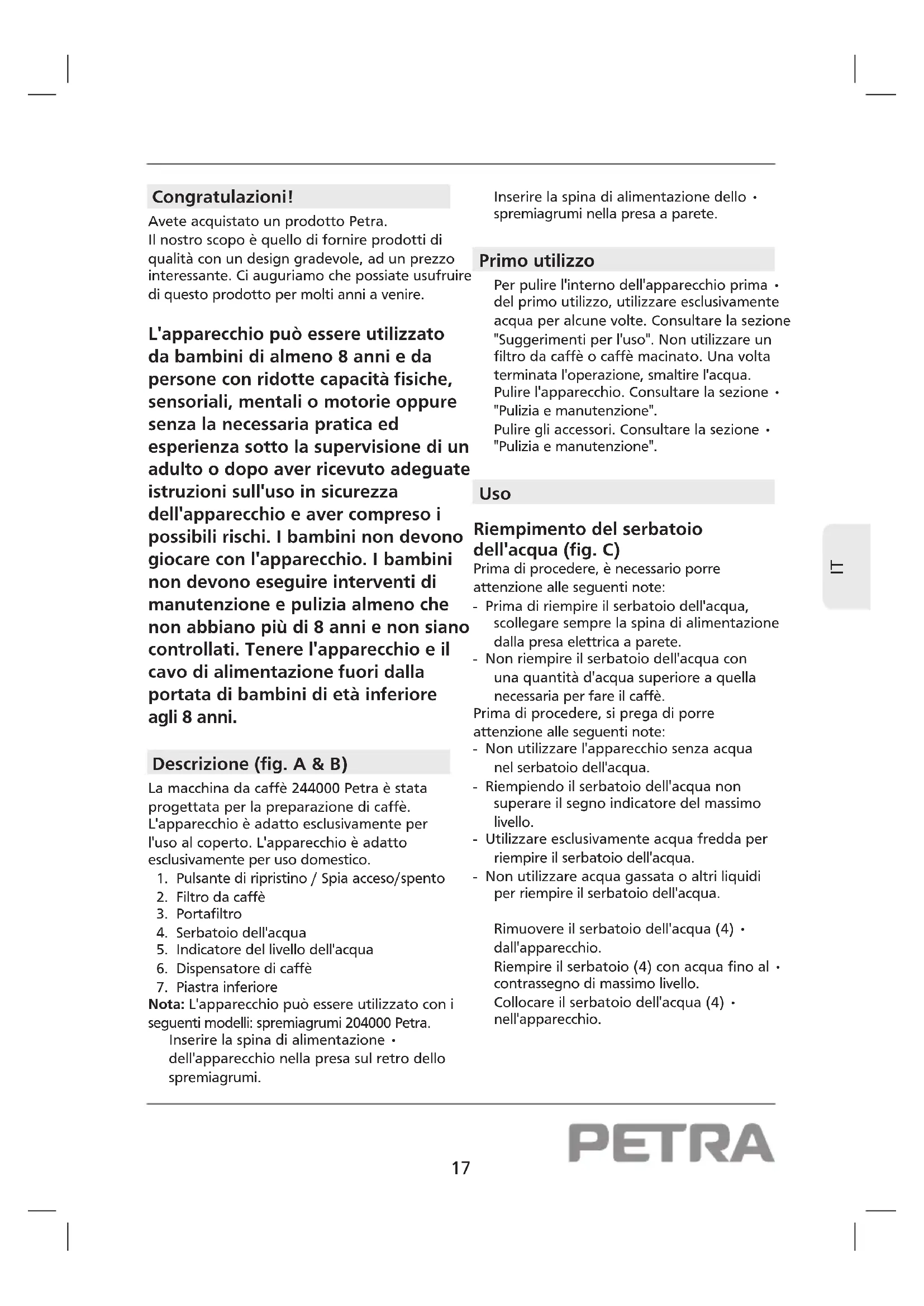 Congratulazioni! Avete acquistato un prodotto Petra. Il nostro scopo è quello di fornire prodotti di qualità con un design gradevole, ad un prezzo interessante. Ci auguriamo che possiate usufruire di questo prodotto per molti anni a venire. L'apparecchio può essere utilizzato da bambini di almeno 8 anni e da persone con ridotte capacità fisiche, sensoriali, mentali o motorie oppure senza la necessaria pratica ed esperienza sotto la supervisione di un adulto o dopo aver ricevuto adeguate istruzioni sull'uso in sicurezza dell'apparecchio e aver compreso i possibili rischi. I bambini non devono giocare con l'apparecchio. I bambini non devono eseguire interventi di manutenzione e pulizia almeno che non abbiano più di 8 anni e non siano controllati. Tenere l'apparecchio e il cavo di alimentazione fuori dalla portata di bambini di età inferiore agli 8 anni. Descrizione (fig. A & B) La macchina da caffè 244000 Petra è stata progettata per la preparazione di caffè. L'apparecchio è adatto esclusivamente per l'uso al coperto. L'apparecchio è adatto esclusivamente per uso domestico.