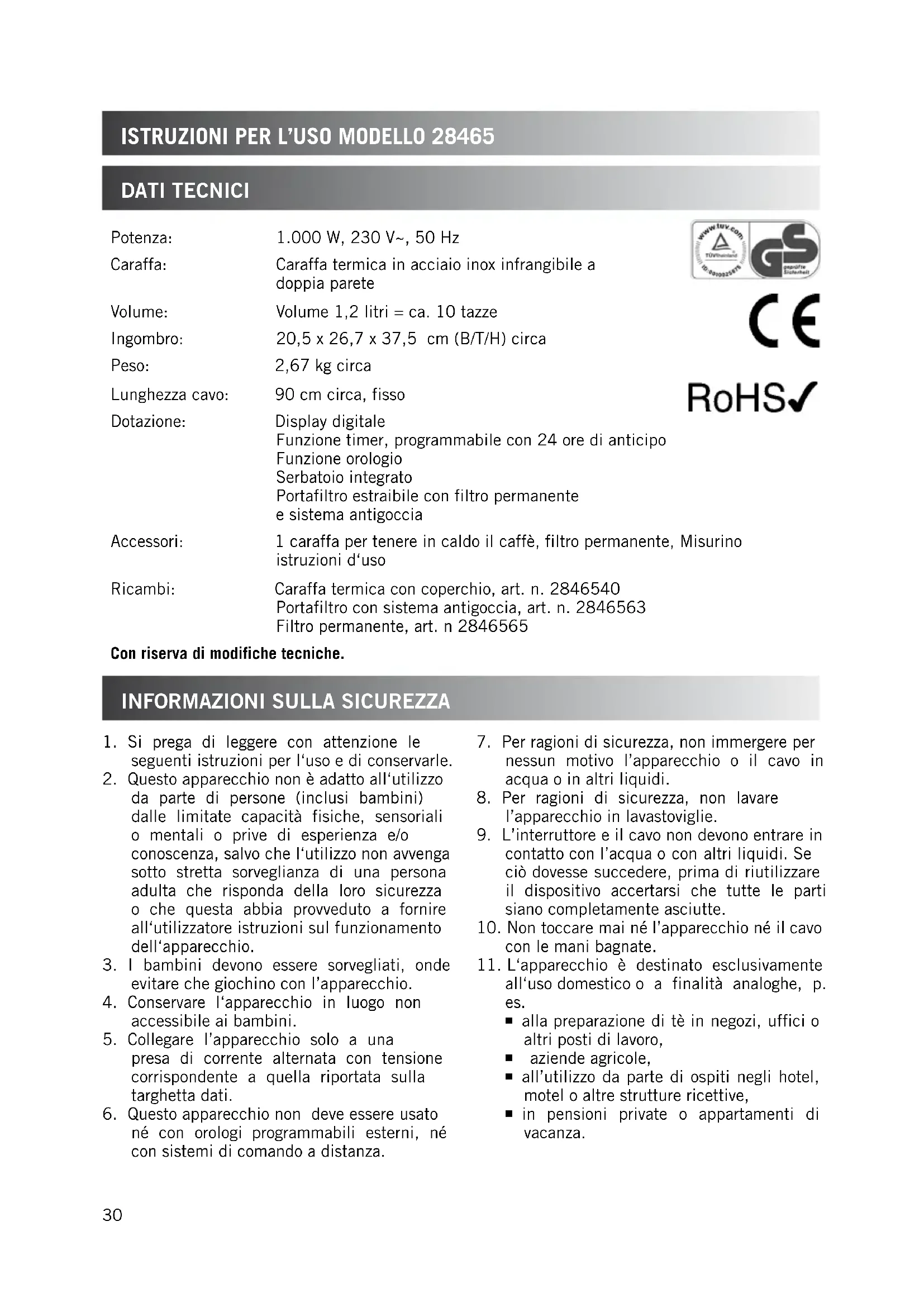 all‘uso domestico o a finalità analoghe, p. es. alla preparazione di tè in negozi, uffici o altri posti di lavoro, aziende agricole, all’utilizzo da parte di ospiti negli hotel, motel o altre strutture ricettive, in pensioni private o appartamenti di vacanza. Potenza: 1.000 W, 230 V~, 50 Hz Caraffa: Caraffa termica in acciaio inox infrangibile a doppia parete Volume: Volume 1,2 litri = ca. 10 tazze Ingombro: 20,5 x 26,7 x 37,5 cm (B/T/H) circa Peso: 2,67 kg circa Lunghezza cavo: 90 cm circa, fisso Dotazione: Display digitale Funzione timer, programmabile con 24 ore di anticipo Funzione orologio Serbatoio integrato Portafiltro estraibile con filtro permanente e sistema antigoccia Accessori: 1 caraffa per tenere in caldo il caffè, filtro permanente, Misurino istruzioni d‘uso Ricambi: Caraffa termica con coperchio, art. n. 2846540 Portafiltro con sistema antigoccia, art. n. 2846563 Filtro permanente, art. n 2846565 Con riserva di modifiche tecniche.31 consigli per preparare un ottimo caffè