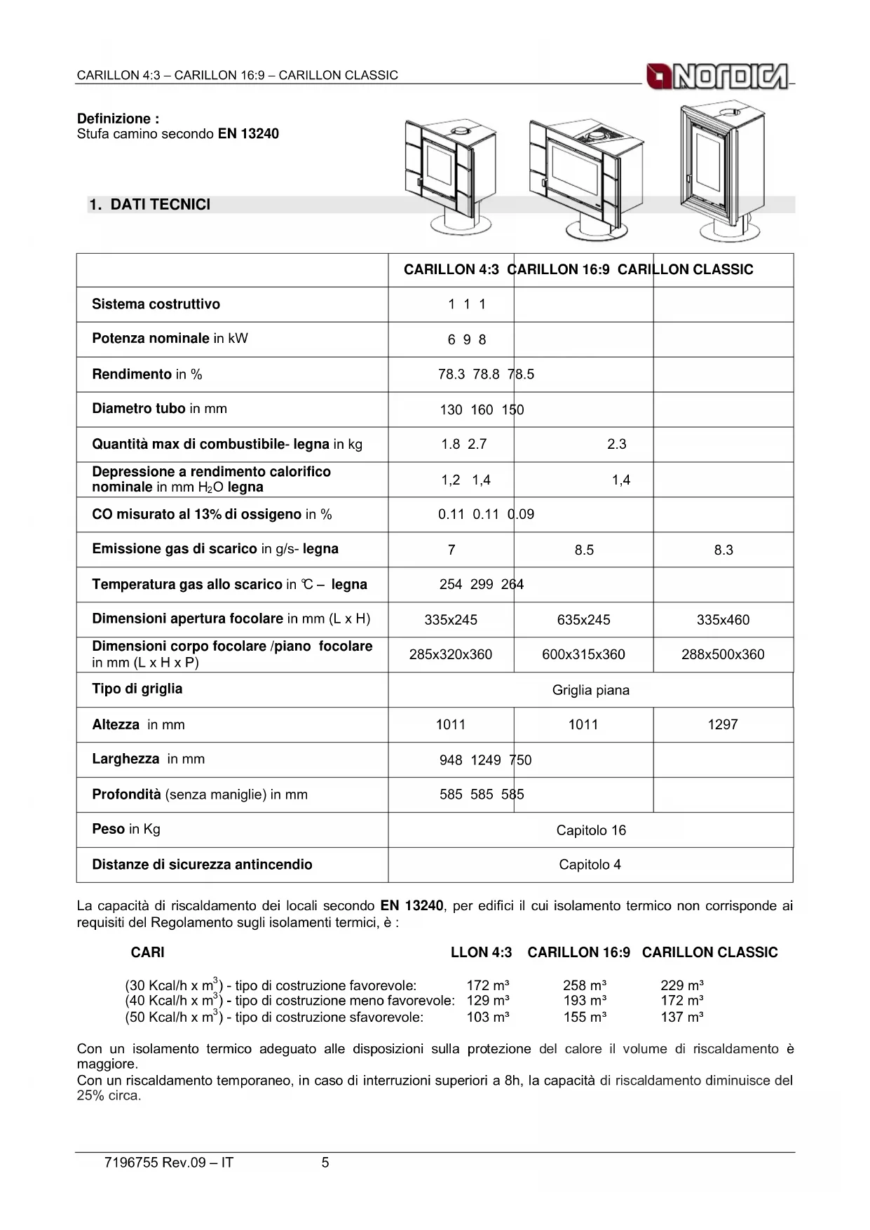 Peso in Kg Capitolo 16 Distanze di sicurezza antincendio Capitolo 4 La capacità di riscaldamento dei locali secondo EN 13240, per edifici il cui isolamento termico non corrisponde ai requisiti del Regolamento sugli isolamenti termici, è : CARI