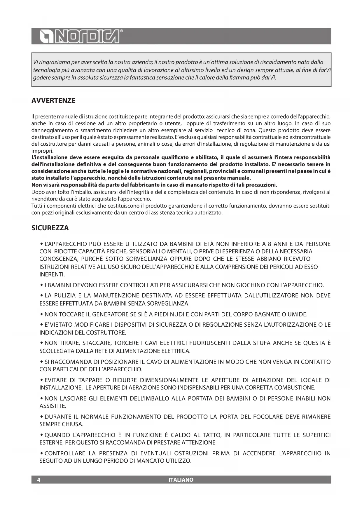 Le operazioni di pulizia periodica, come indicato nel presente manuale uso e manutenzione, devono essere eseguite prestando la massima cura dopo aver letto le indicazioni, le procedure e le tempistiche descritte nel presente manuale uso e manutenzione. Controllare e pulire, almeno una volta all’anno, la presa d’aria esterna. Il camino deve essere regolarmente ramazzato dallo spazzacamino. Fate controllare dal Vostro spazzacamino responsabile di zona la regolare installazione del prodotto, il collegamento al camino e l’aerazione. IMPORTANTE: LA PULIZIA E LA MANUTENZIONE DEVE ESSERE ESEGUITA ESCLUSIVAMENTE AD APPARECCHIO FREDDO. Si possono usare esclusivamente parti di ricambio espressamente autorizzate ed oerte da La NORDICA S.p.A. In caso di bisogno Vi preghiamo di rivolgerVi al Vs rivenditore specializzato. L’ APPARECCHIO NON PUÒ ESSERE MODIFICATO! 12ITALIANO PULIZIA VETRO Tramite uno specico ingresso dell’aria secondaria la formazione di deposito di sporco, sul vetro della porta, viene ecacemente rallentata. Non può comunque mai essere evitata con l’utilizzo dei combustibili solidi (es. legna umida ) e questo non è da considerarsi come un difetto dell’apparecchio . IMPORTANTE: la pulizia del vetro panoramico deve essere eseguita solo ed esclusivamente a apparecchio freddo per evitarne l’esplosione. Per la pulizia si possono usare dei prodotti specici oppure, con una palla di carta di giornale (quotidiano) inumidita e passata nella cenere. Non usare comunque panni, o prodotti abrasivi o chimicamente aggressivi. La corretta procedura di accensione, l’utilizzo di quantità e tipi di combustibili idonei, il corretto posizionamento del registro dell’aria secondaria, il suciente tiraggio del camino e la presenza dell’aria comburente sono indispensabili per il funzionamento ottimale dell’apparecchio e per mantenere pulito il vetro. ROTTURA DEI VETRI: i vetri essendo in vetroceramica resistenti no ad uno sbalzo termico di 750°C, non sono soggetti a shock termici. La loro rottura può essere causata solo da shock meccanici (urti o chiusura violenta della porta ecc.). Pertanto la sostituzione non è in garanzia.
