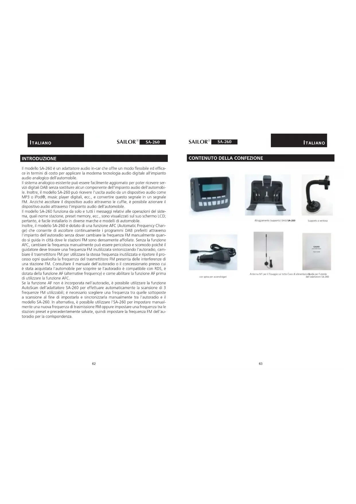 Alloggiamento (supporto) Unità SA-260 Antenna M1 per il fissaggio sul tetto Cavo di alimentazione con spina per accendisigari Supporto a ventosaGuida per l’utente dell’adattatore SA-260ITALIANO