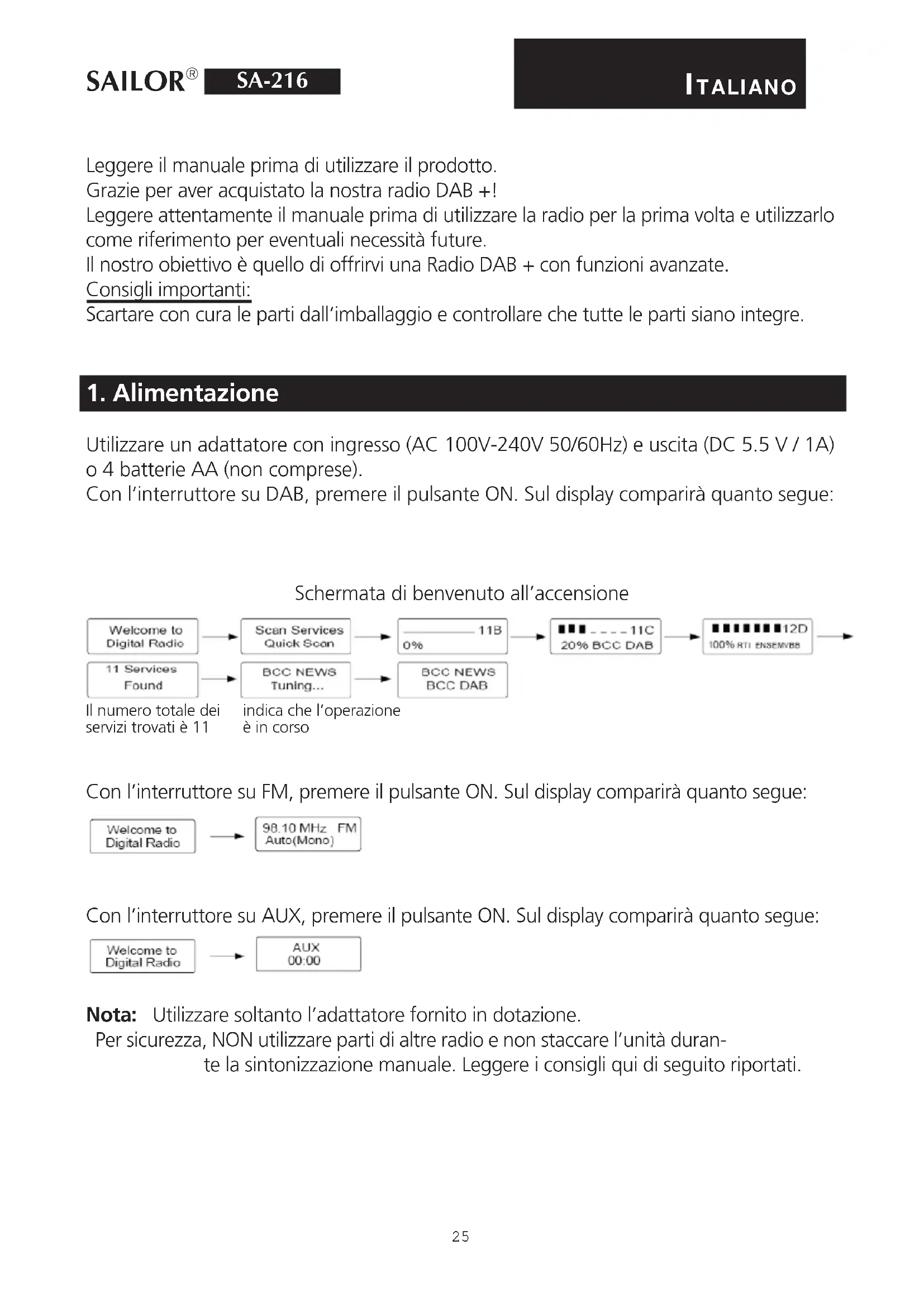 Utilizzare un adattatore con ingresso (AC 100V-240V 50/60Hz) e uscita (DC 5.5 V / 1A) o 4 batterie AA (non comprese). Con l’interruttore su DAB, premere il pulsante ON. Sul display comparirà quanto segue: Schermata di benvenuto all’accensione Con l’interruttore su FM, premere il pulsante ON. Sul display comparirà quanto segue: Con l’interruttore su AUX, premere il pulsante ON. Sul display comparirà quanto segue: Nota: Utilizzare soltanto l’adattatore fornito in dotazione. Per sicurezza, NON utilizzare parti di altre radio e non staccare l’unità duran- te la sintonizzazione manuale. Leggere i consigli qui di seguito riportati. Il numero totale dei servizi trovati è 11indica che l’operazione è in corsoITALIANO