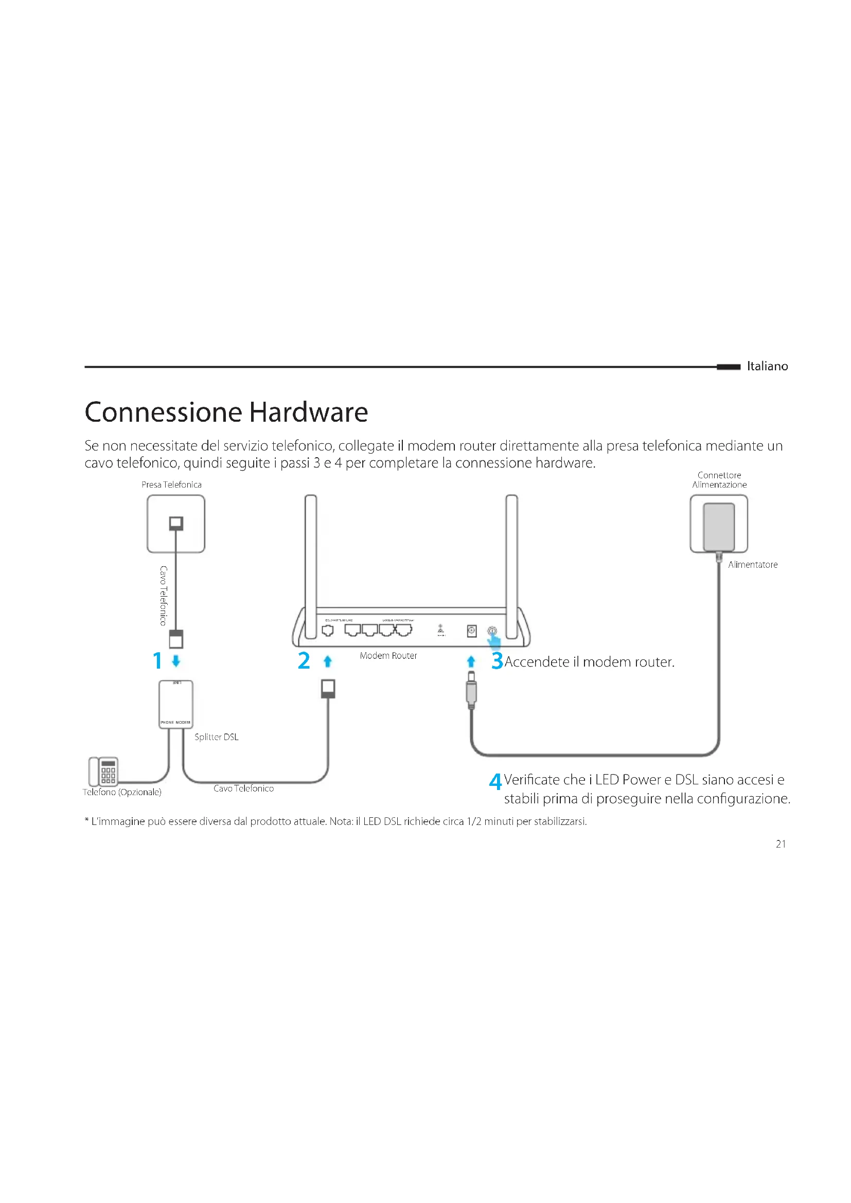 WPS/ RESETLAN3 LAN4/WAN WIFI Power* L’immagine può essere diversa dal prodotto attuale. Nota: il LED DSL richiede circa 1/2 minuti per stabilizzarsi. Vericate che i LED Power e DSL siano accesi e stabili prima di proseguire nella congurazione. Presa TelefonicaCavo TelefonicoCavo TelefonicoModem Router Accendete il modem router. Connettore AlimentazioneAlimentatoreSplitter DSLTelefono (Opzionale)Italiano