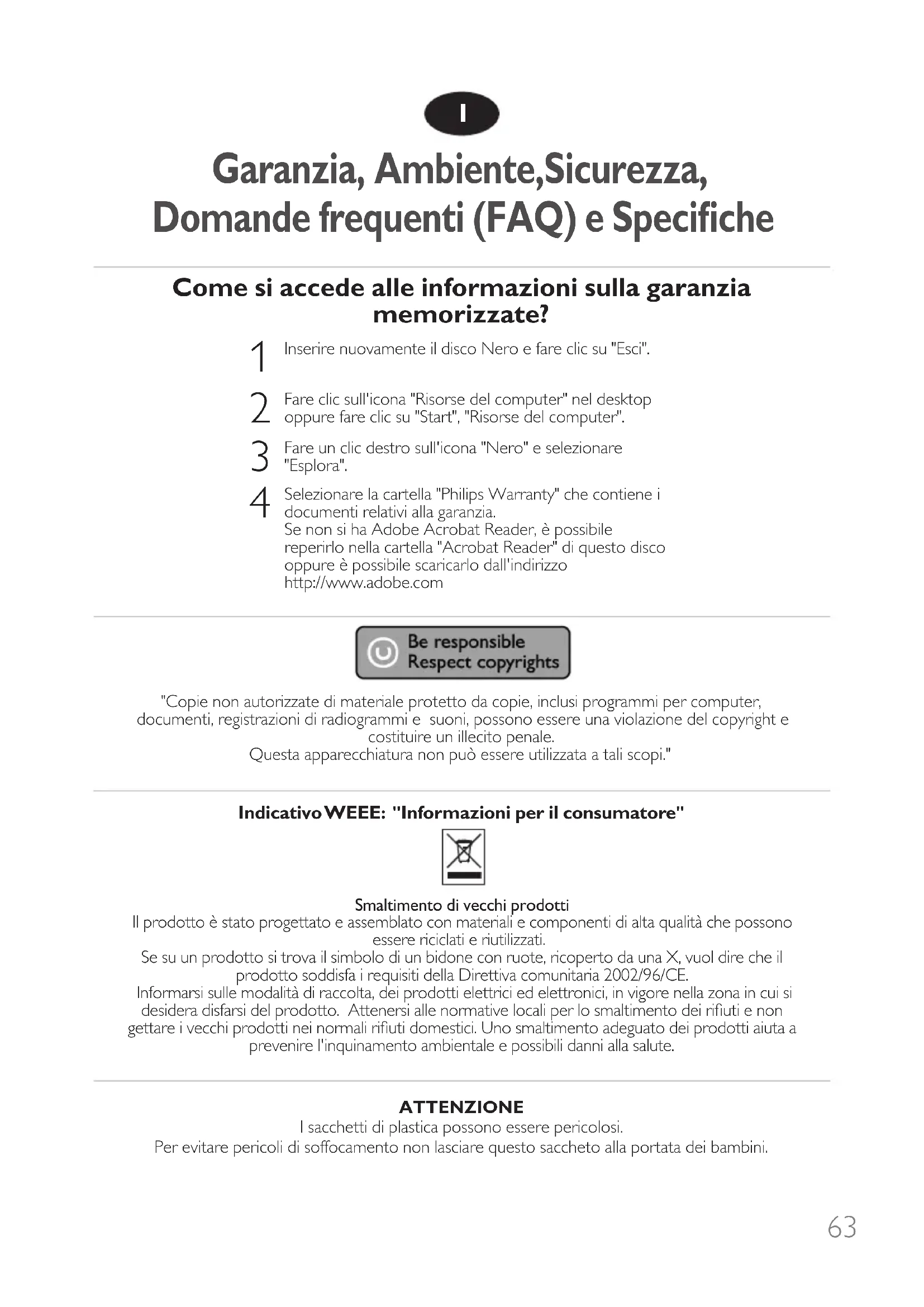 Selezionare la cartella "Philips Warranty" che contiene i documenti relativi alla garanzia. Se non si ha Adobe Acrobat Reader, è possibile reperirlo nella cartella "Acrobat Reader" di questo disco oppure è possibile scaricarlo dall'indirizzo http://www.adobe.com "Copie non autorizzate di materiale protetto da copie, inclusi programmi per computer, documenti, registrazioni di radiogrammi e suoni, possono essere una violazione del copyright e costituire un illecito penale. Questa apparecchiatura non può essere utilizzata a tali scopi." Indicativo WEEE: "Informazioni per il consumatore" Smaltimento di vecchi prodotti Il prodotto è stato progettato e assemblato con materiali e componenti di alta qualità che possono essere riciclati e riutilizzati. Se su un prodotto si trova il simbolo di un bidone con ruote, ricoperto da una X, vuol dire che il prodotto soddisfa i requisiti della Direttiva comunitaria 2002/96/CE. Informarsi sulle modalità di raccolta, dei prodotti elettrici ed elettronici, in vigore nella zona in cui si desidera disfarsi del prodotto. Attenersi alle normative locali per lo smaltimento dei rifiuti e non gettare i vecchi prodotti nei normali rifiuti domestici. Uno smaltimento adeguato dei prodotti aiuta a prevenire l'inquinamento ambientale e possibili danni alla salute. ATTENZIONE I sacchetti di plastica possono essere pericolosi. Per evitare pericoli di soffocamento non lasciare questo saccheto alla portata dei bambini. Garanzia, Ambiente,Sicurezza, Domande frequenti (FAQ) e Specifiche I64 Domande frequenti (FAQ) Domanda 1: Utilizzo un PC con Windows 98 Second Edition in cui non è installata un'unità CDROM, ma posseggo un altro PC. Come devo procedere per installare i driver?