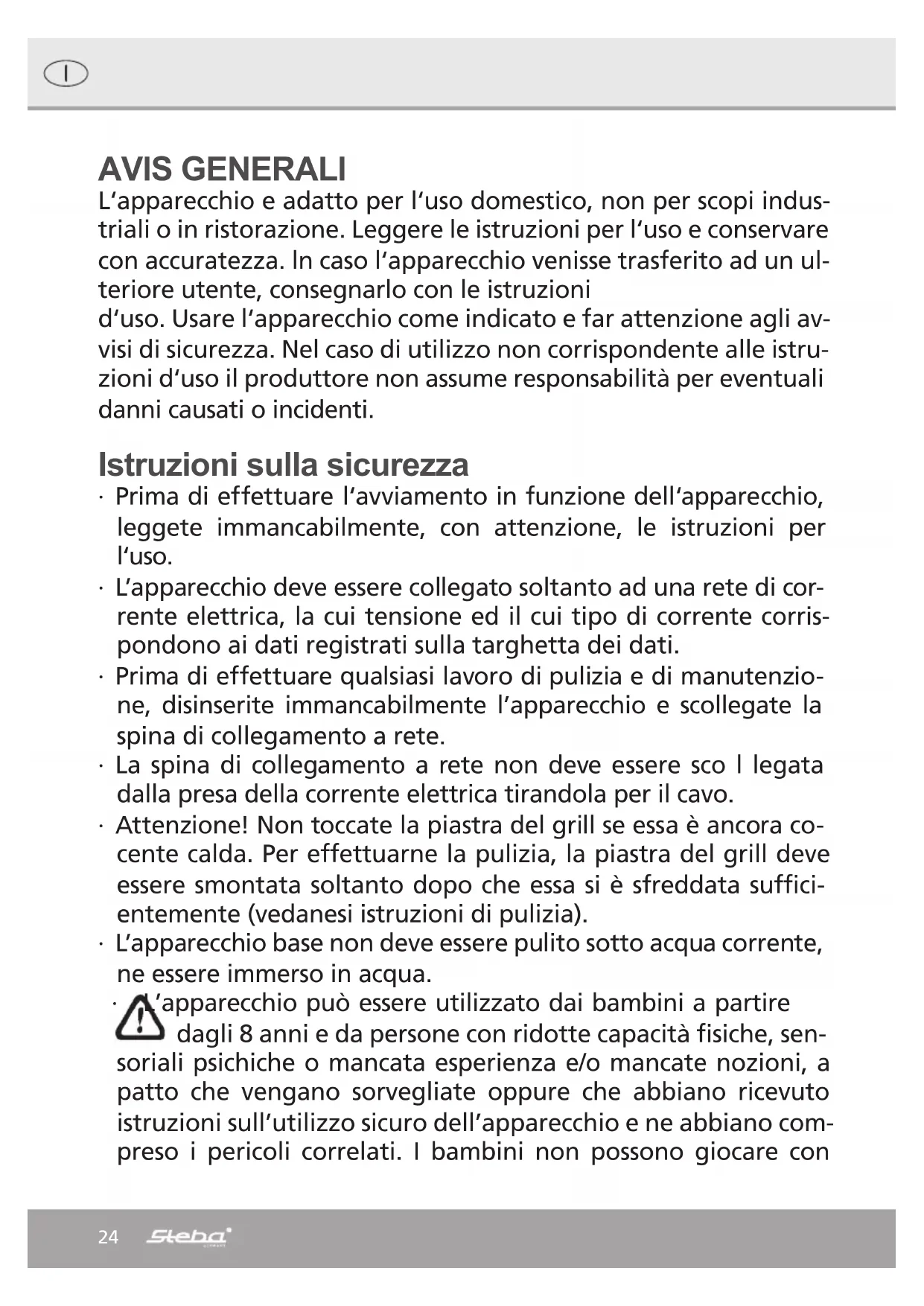 L'apparecchio e adatto per l'uso domestico, non per scopi industriali o in ristorazione. Leggere le istruzioni per l'uso e conservare con accuratezza. In caso l'apparecchio venisse trasferito ad un ulterioriore utente, consegnarlo con le istruzioni