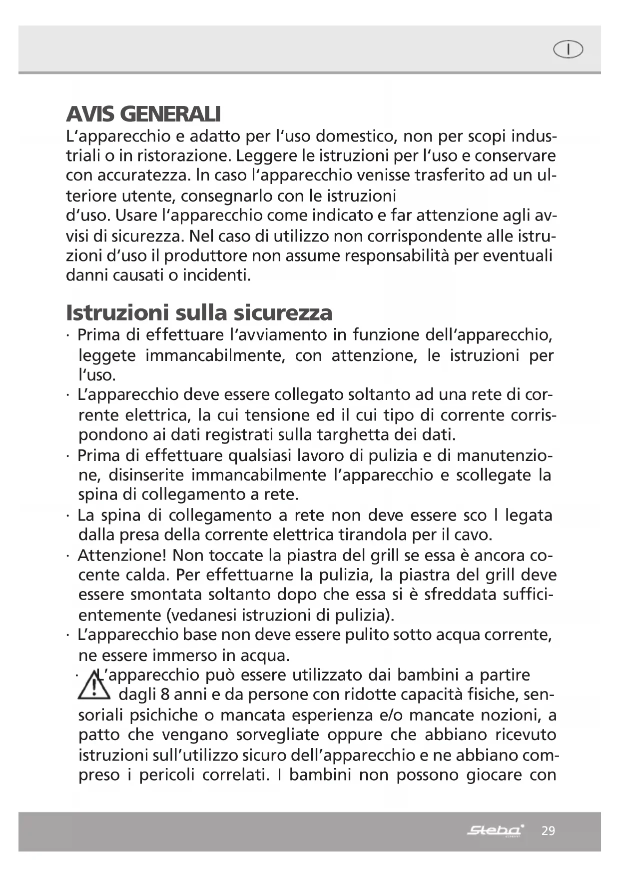 L'apparecchio e adatto per l'uso domestico, non per scopi industriali o in ristorazione. Leggere le istruzioni per l'uso e conservare con accuratezza. In caso l'apparecchio venisse trasferito ad un ulterioriore utente, consegnarlo con le istruzioni
