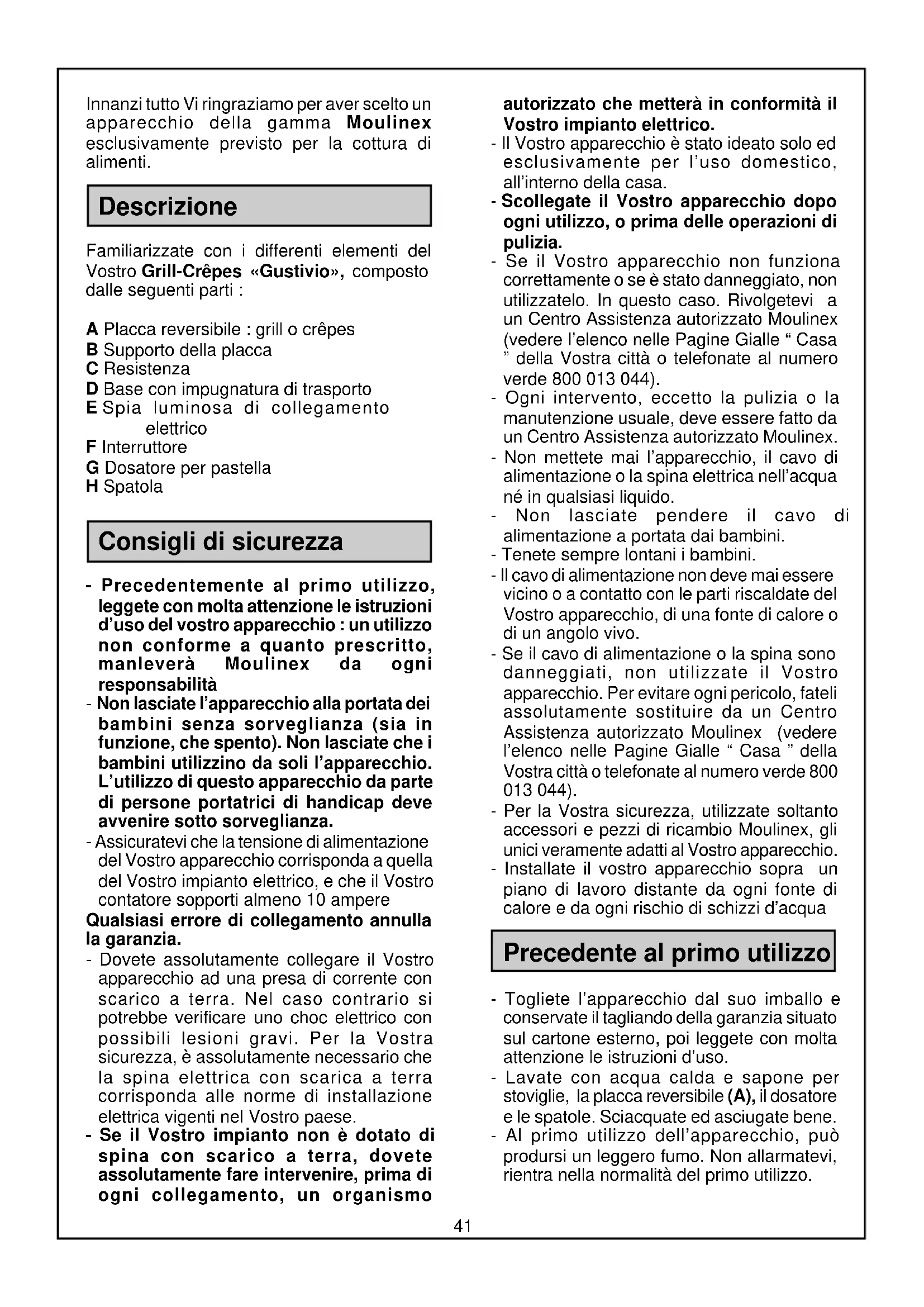 - Als u geen maïsmeel kunt vinden, gebruik dan tarwemeel. . PANCAKES (ongeveer 12 pancakes) 125 g bloem 1/2 theelepel suiker 1/2 theelepel zout 1 theelepel zuiveringszout 3/4 theelepel bakpoeder 1 ei 30 g gesmolten boter 25 cl melk 30 à 45 g gesmolten boter om te bakken - Maak een beslag van bovenstaande ingrediënten. - Laat het beslag 30 min rusten; als het te dik wordt, voegt u wat melk toe. - Schenk 2 maatschepjes beslag in iedere uitsparing. - Keer de pancake met een spatel zodra deze loskomt van de plaat (ongeveer 2 min bakken per kant). . Variant: Pancake met bosbessen: voeg 200 g verse bosbessen toe vlak voordat u gaat bakken. Serveren met stroop.41 Innanzi tutto Vi ringraziamo per aver scelto un apparecchio della gamma Moulinex esclusivamente previsto per la cottura di alimenti. Descrizione Familiarizzate con i differenti elementi del Vostro Grill-Crêpes «Gustivio», composto dalle seguenti parti : A Placca reversibile : grill o crêpes B Supporto della placca C Resistenza D Base con impugnatura di trasporto E Spia luminosa di collegamento elettrico F Interruttore G Dosatore per pastella H Spatola Consigli di sicurezza - Precedentemente al primo utilizzo, leggete con molta attenzione le istruzioni d’uso del vostro apparecchio : un utilizzo non conforme a quanto prescritto, manleverà Moulinex da ogni responsabilità - Non lasciate l’apparecchio alla portata dei bambini senza sorveglianza (sia in funzione, che spento). Non lasciate che i bambini utilizzino da soli l’apparecchio. L’utilizzo di questo apparecchio da parte di persone portatrici di handicap deve avvenire sotto sorveglianza. - Assicuratevi che la tensione di alimentazione del Vostro apparecchio corrisponda a quella del Vostro impianto elettrico, e che il Vostro contatore sopporti almeno 10 ampere Qualsiasi errore di collegamento annulla la garanzia. - Dovete assolutamente collegare il Vostro apparecchio ad una presa di corrente con scarico a terra. Nel caso contrario si potrebbe verificare uno choc elettrico con possibili lesioni gravi. Per la Vostra sicurezza, è assolutamente necessario che la spina elettrica con scarica a terra corrisponda alle norme di installazione elettrica vigenti nel Vostro paese. - Se il Vostro impianto non è dotato di spina con scarico a terra, dovete assolutamente fare intervenire, prima di ogni collegamento, un organismo autorizzato che metterà in conformità il Vostro impianto elettrico. - Il Vostro apparecchio è stato ideato solo ed esclusivamente per l’uso domestico, all’interno della casa. - Scollegate il Vostro apparecchio dopo ogni utilizzo, o prima delle operazioni di pulizia. - Se il Vostro apparecchio non funziona correttamente o se è stato danneggiato, non utilizzatelo. In questo caso. Rivolgetevi a un Centro Assistenza autorizzato Moulinex (vedere l’elenco nelle Pagine Gialle “ Casa ” della Vostra città o telefonate al numero verde 800 013 044). - Ogni intervento, eccetto la pulizia o la manutenzione usuale, deve essere fatto da un Centro Assistenza autorizzato Moulinex. - Non mettete mai l’apparecchio, il cavo di alimentazione o la spina elettrica nell’acqua né in qualsiasi liquido. - Non lasciate pendere il cavo di alimentazione a portata dai bambini. - Tenete sempre lontani i bambini. - Il cavo di alimentazione non deve mai essere vicino o a contatto con le parti riscaldate del Vostro apparecchio, di una fonte di calore o di un angolo vivo. - Se il cavo di alimentazione o la spina sono danneggiati, non utilizzate il Vostro apparecchio. Per evitare ogni pericolo, fateli assolutamente sostituire da un Centro Assistenza autorizzato Moulinex (vedere l’elenco nelle Pagine Gialle “ Casa ” della Vostra città o telefonate al numero verde 800 013 044). - Per la Vostra sicurezza, utilizzate soltanto accessori e pezzi di ricambio Moulinex, gli unici veramente adatti al Vostro apparecchio. - Installate il vostro apparecchio sopra un piano di lavoro distante da ogni fonte di calore e da ogni rischio di schizzi d’acqua Precedente al primo utilizzo - Togliete l’apparecchio dal suo imballo e conservate il tagliando della garanzia situato sul cartone esterno, poi leggete con molta attenzione le istruzioni d’uso. - Lavate con acqua calda e sapone per stoviglie, la placca reversibile (A), il dosatore e le spatole. Sciacquate ed asciugate bene. - Al primo utilizzo dell’apparecchio, può prodursi un leggero fumo. Non allarmatevi, rientra nella normalità del primo utilizzo.42 - Durante le prime cotture, ricordatevi di oleare leggermente la placca. Avviamento - Collegate l’apparecchio. Girate l’interruttore. La spia (E) si illumina. - Lasciate pre-riscaldare per circa 15 minuti qualunque sia il vostro uso : grill o crêpes. . Funzione Grill : - Fate attenzione, quando grigliate della carne con grasso, ai possibili schizzi. - Bucherellate le vostre salsicce, prima di grigliarle. - Per girare a prendere la carne, non usate mai utensili in metallo. . Funzione Crêpes : - Per versare la quantità di pastella necessaria, utilizzate sempre il dosatore. - Livellate la pastella con il dorso del dosatore. - Per girare o prendere le crespelle, usate sempre la spatola. Pulizia - Scollegate l’apparecchio e lasciatelo raffreddare. - Non immergete mai il corpo dell’apparecchio nell’acqua o sotto l’acqua corrente. Pulitelo con un panno o spugna umidi. Asciugate bene. - Non utilizzate tamponi abrasivi, alcol o polveri dure. - La placca (A) può essere messa in lavastoviglie. Se il vostro apparecchio non funziona, che fare ? - Verificate : . il collegamento dell’apparecchio alla presa elettrica. . che l’interruttore sia ben girato (spia accesa). Il vostro apparecchio seguita a non funzionare ? In questo caso indirizzatevi presso un Centro di assistenza tecnica autorizzato, il cui elenco potete trovare sulle Pagine Gialle Casa di ogni città o chiamando il numero verde : 800 013