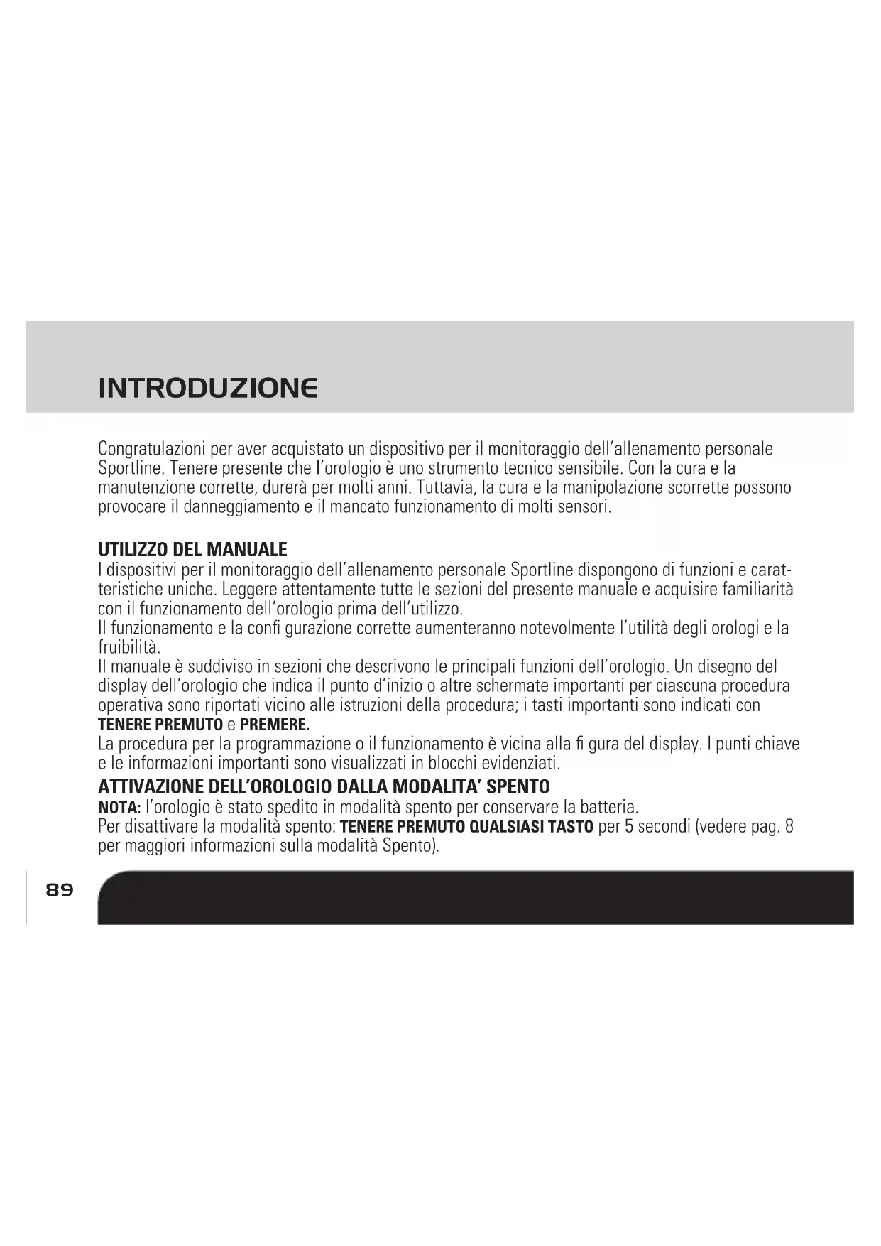 INDIVIDUAZIONE GUASTI 107 SP4964IS03SPO.indd 88SP4964IS03SPO.indd 88 7/28/10 3:43 PM7/28/10 3:43 PM89 INTRODUZIONE Congratulazioni per aver acquistato un dispositivo per il monitoraggio dell’allenamento personale Sportline. Tenere presente che l’orologio è uno strumento tecnico sensibile. Con la cura e la manutenzione corrette, durerà per molti anni. Tuttavia, la cura e la manipolazione scorrette possono provocare il danneggiamento e il mancato funzionamento di molti sensori.