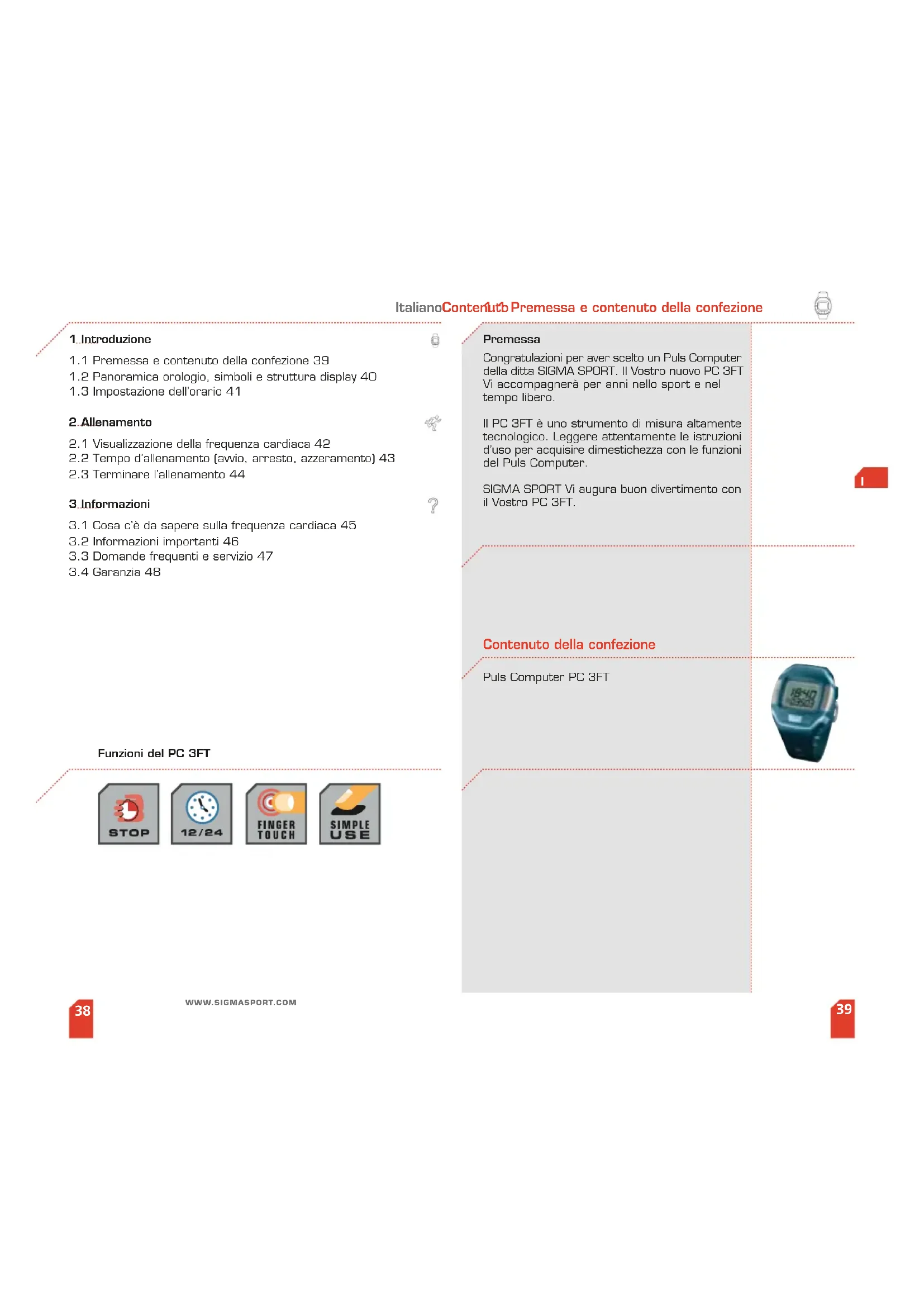 Premessa Congratulazioni per aver scelto un Puls Computer della ditta SIGMA SPORT. Il Vostro nuovo PC 3FT Vi accompagnerà per anni nello sport e nel tempo libero. Il PC 3FT è uno strumento di misura altamente tecnologico. Leggere attentamente le istruzioni d’uso per acquisire dimestichezza con le funzioni del Puls Computer. SIGMA SPORT Vi augura buon divertimento con il Vostro PC 3FT. Puls Computer PC 3FT