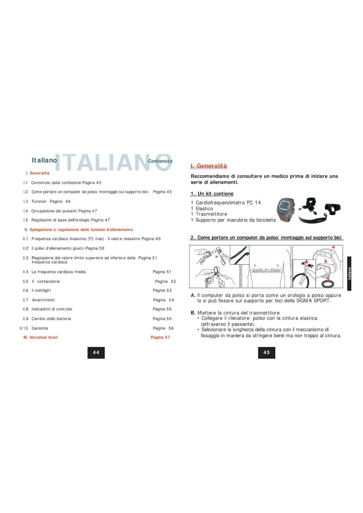 I.1 Contenuto della confezione Pagina 45 I.2 Come portare un computer da polso/montaggio sul supporto bici Pagina 45 I.3 Funzioni Pagina 46 I.4 Occupazione dei pulsanti Pagina 47 I.5 Regolazioni di base dell'orologio Pagina 47