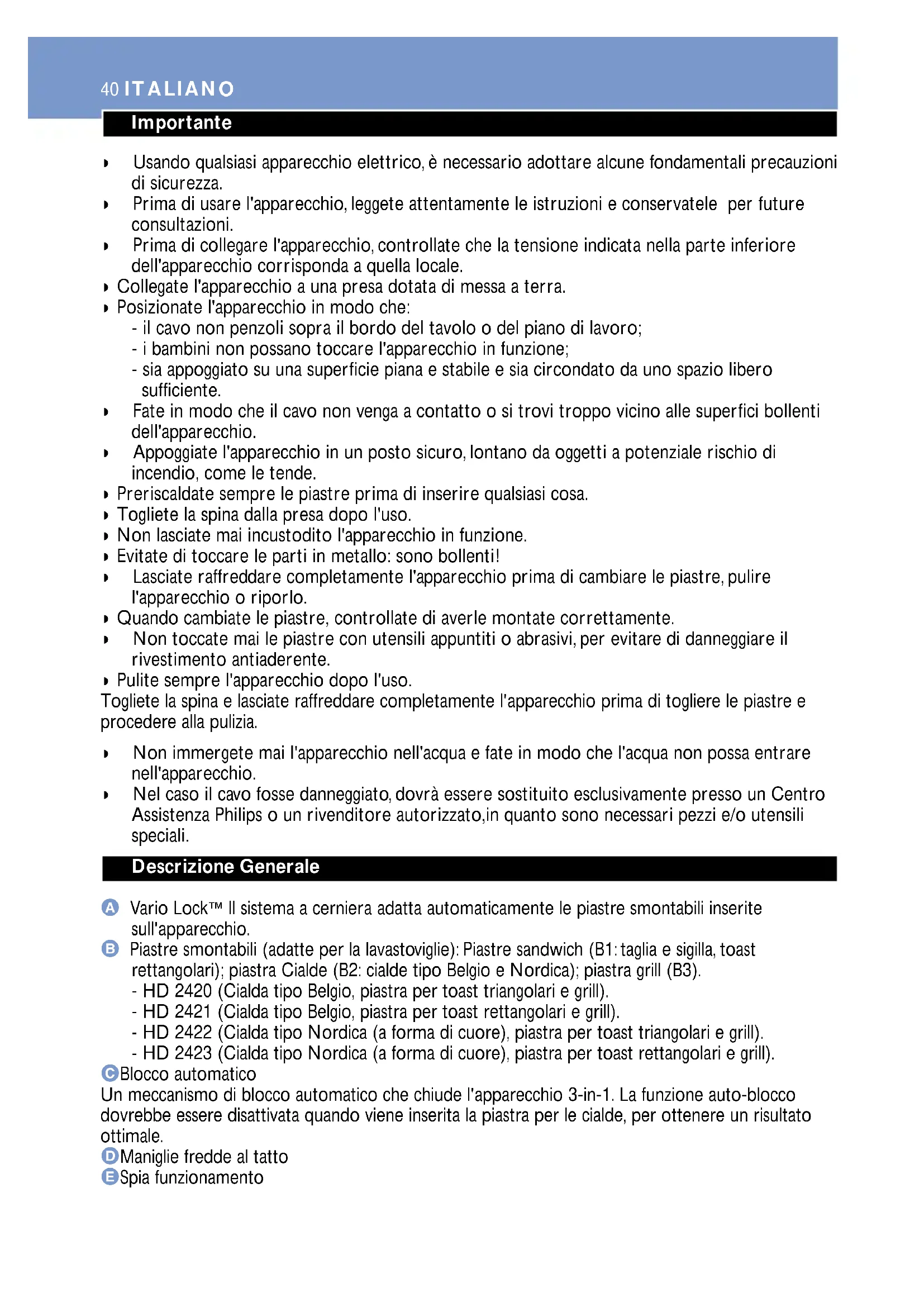 Scarica le istruzioni per il tuo Pinza per croque monsieur in formato PDF gratuitamente! Trova il tuo manuale Cucina HD2423 - PHILIPS e riprendi in mano il tuo dispositivo elettronico. In questa pagina sono pubblicati tutti i documenti necessari per l'utilizzo del tuo dispositivo. Cucina HD2423 del marchio PHILIPS.
