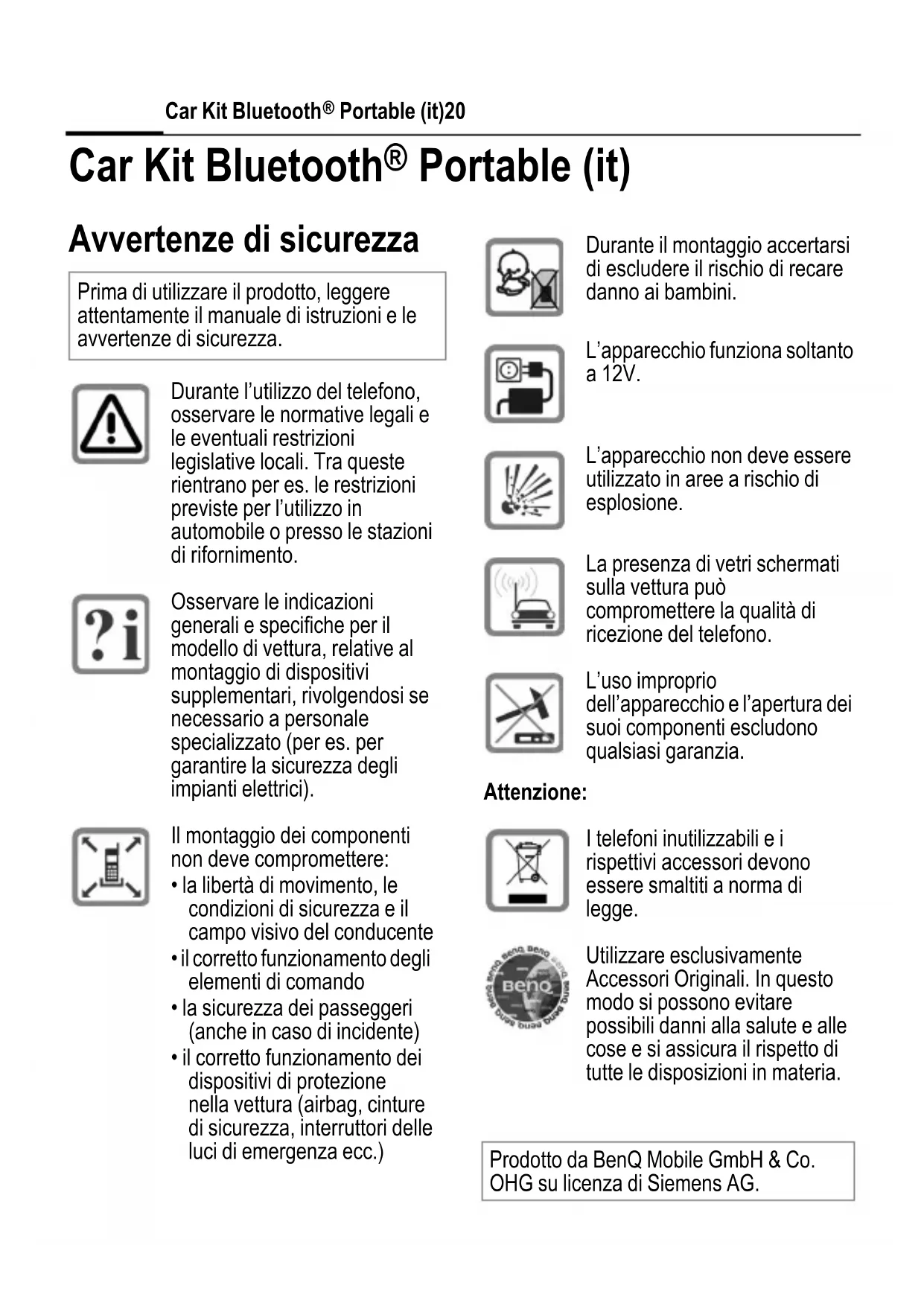 - il corretto funzionamento dei dispositivi di protezione nella vettura (airbag, cinture di sicurezza, interruttori delle luci di emergenza ecc.) Durante il montaggio accertarsi di escludere il rischio di recare danno ai bambini. L’apparecchio funziona soltanto a 12V. L’apparecchio non deve essere utilizzato in aree a rischio di esplosione. La presenza di vetri schermati sulla vettura può compromettere la qualità di ricezione del telefono. L’uso improprio dell’apparecchio e l’apertura dei suoi componenti escludono qualsiasi garanzia. Attenzione: I telefoni inutilizzabili e i rispettivi accessori devono essere smaltiti a norma di legge. Utilizzare esclusivamente Accessori Originali. In questo modo si possono evitare possibili danni alla salute e alle cose e si assicura il rispetto di tutte le disposizioni in materia. Prodotto da BenQ Mobile GmbH & Co. OHG su licenza di Siemens AG.right page (21) of CKBP HKW-700 it, A31008-H7421-A110-1-ZE19 (09.02.2006, 19:03) © Siemens AG 2003, Z:\Rust\Accessories\05GUW00118 CKBP Mikrofon Leaflet\Work\Satz\Frame und Grafik\HKW-700_it.fm 21Car Kit Bluetooth