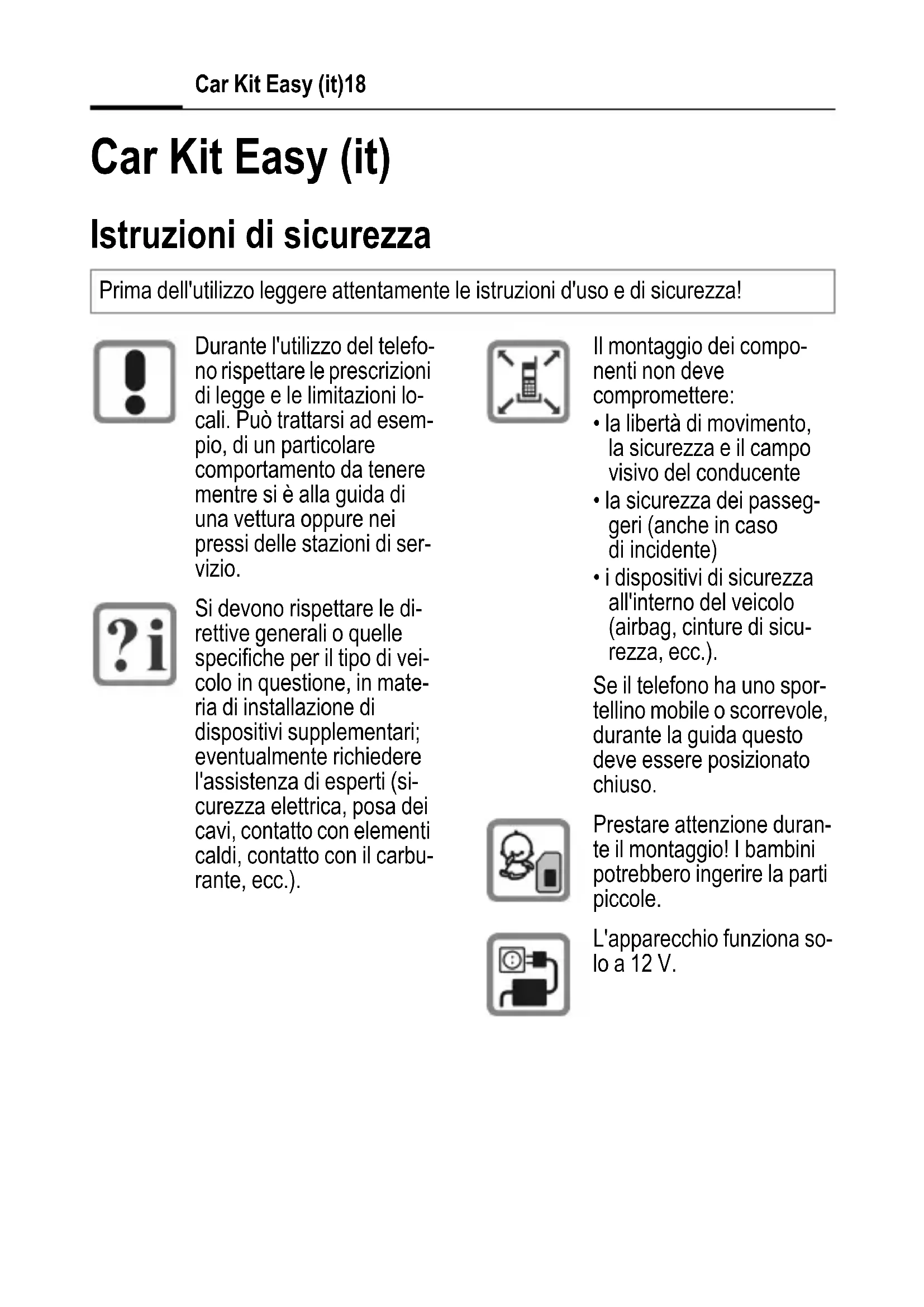 - Halteschalen zum Austausch Produkte erhältlich im Fachhandel oder besuchen Sie unseren Online-Shop unter: In Ländern, in denen unser Produkt nicht durch authorisierte Händler ver- kauft wird, werden keine Austausch- bzw. Reparaturleistungen angeboten. Spannungs- versorgung 10,8 V bis 16 V Strom- aufnahme max. 1 A / max. 1 mA (Ruhe- strom) Betriebs- temperatur –20 °C bis +55 °C Lautsprecher- ausgangs- leistung max. 1,3 W Siemens Original Accessories www.siemens- mobile.com/shopCar Kit Easy (it)18 Car Kit Easy (it) Istruzioni di sicurezza Prima dell'utilizzo leggere attentamente le istruzioni d'uso e di sicurezza! Durante l'utilizzo del telefo- no rispettare le prescrizioni di legge e le limitazioni lo- cali. Può trattarsi ad esem- pio, di un particolare comportamento da tenere mentre si è alla guida di una vettura oppure nei pressi delle stazioni di ser- vizio. Si devono rispettare le di- rettive generali o quelle specifiche per il tipo di vei- colo in questione, in mate- ria di installazione di dispositivi supplementari; eventualmente richiedere l'assistenza di esperti (si- curezza elettrica, posa dei cavi, contatto con elementi caldi, contatto con il carbu- rante, ecc.). Il montaggio dei compo- nenti non deve compromettere: