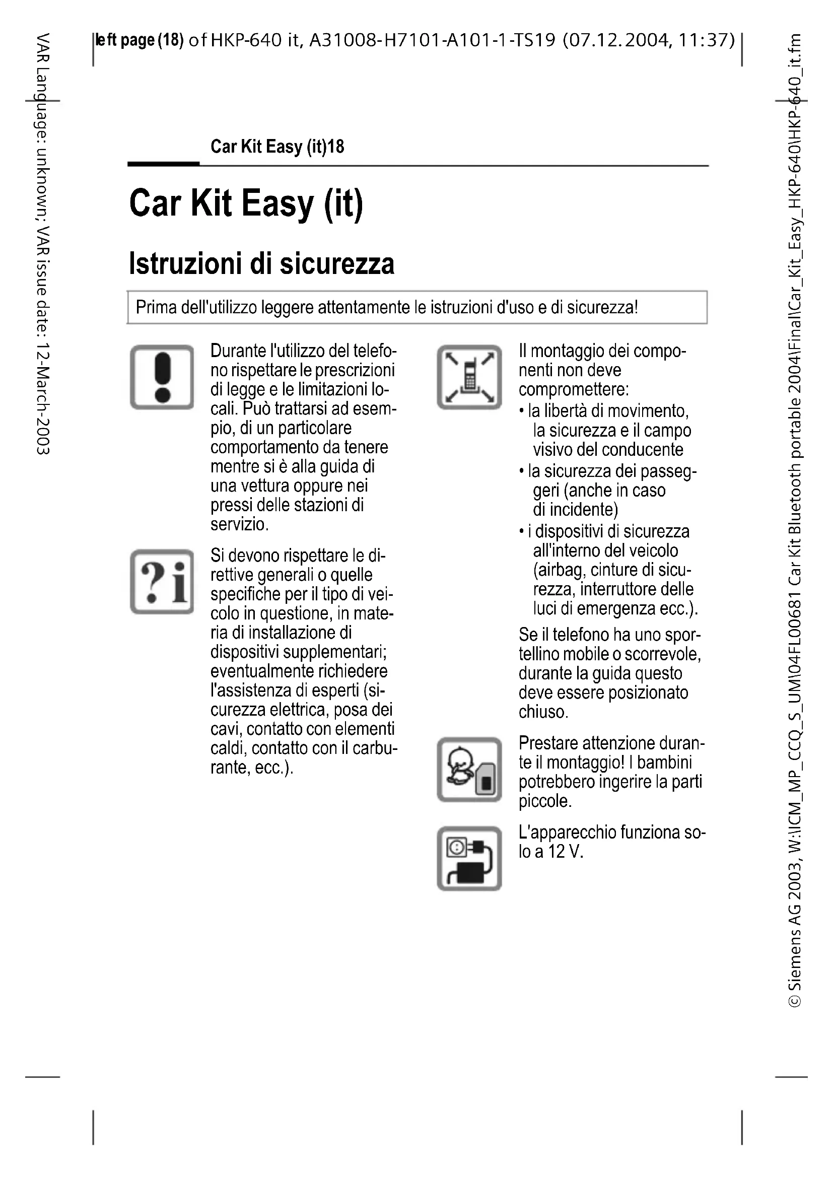 37) Car Kit Easy (it)18 VAR Language: unknown; VAR issue date: 12-March-2003 Car Kit Easy (it) Istruzioni di sicurezza Prima dell'utilizzo leggere attentamente le istruzioni d'uso e di sicurezza! Durante l'utilizzo del telefo- no rispettare le prescrizioni di legge e le limitazioni lo- cali. Può trattarsi ad esem- pio, di un particolare comportamento da tenere mentre si è alla guida di una vettura oppure nei pressi delle stazioni di servizio. Si devono rispettare le di- rettive generali o quelle specifiche per il tipo di vei- colo in questione, in mate- ria di installazione di dispositivi supplementari; eventualmente richiedere l'assistenza di esperti (si- curezza elettrica, posa dei cavi, contatto con elementi caldi, contatto con il carbu- rante, ecc.). Il montaggio dei compo- nenti non deve compromettere: