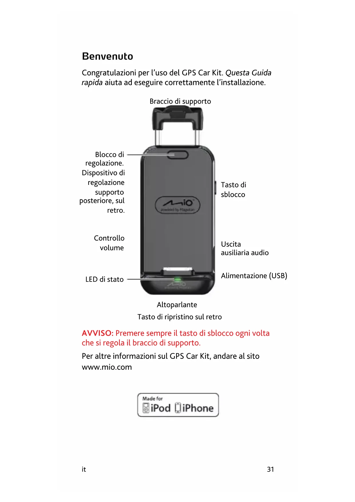 AVVISO: Premere sempre il tasto di sblocco ogni volta che si regola il braccio di supporto. Per altre informazioni sul GPS Car Kit, andare al sito www.mio.com