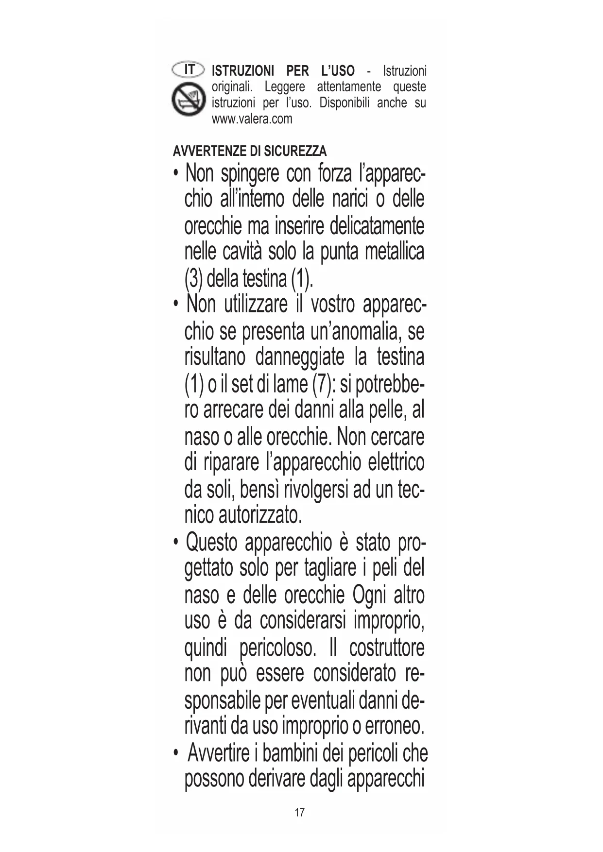- Questo apparecchio è stato pro- gettato solo per tagliare i peli del naso e delle orecchie Ogni altro uso è da considerarsi improprio, quindi pericoloso. Il costruttore non può essere considerato re- sponsabile per eventuali danni de- rivanti da uso improprio o erroneo.