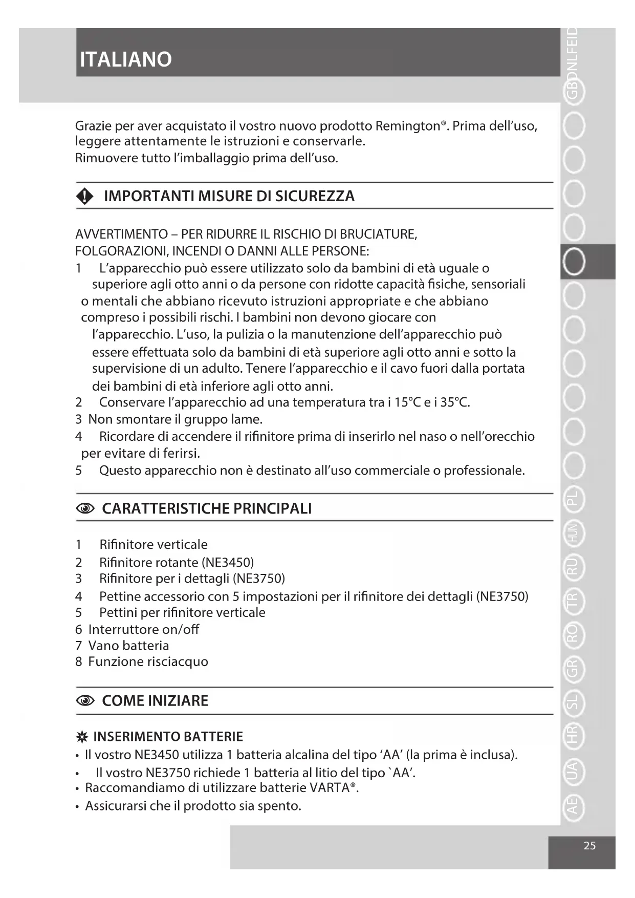 AVVERTIMENTO–PERRIDURREILRISCHIODIBRUCIATURE, FOLGORAZIONI, INCENDI O DANNI ALLE PERSONE: 1 L’apparecchiopuòessereutilizzatosolodabambinidietàugualeo superioreagliottoanniodapersoneconridottecapacitàsiche,sensoriali o mentali che abbiano ricevuto istruzioni appropriate e che abbiano compreso i possibili rischi. I bambini non devono giocare con l’apparecchio.L’uso,lapuliziaolamanutenzionedell’apparecchiopuò essereeettuatasolodabambinidietàsuperioreagliottoanniesottola supervisionediunadulto.Tenerel’apparecchioeilcavofuoridallaportata deibambinidietàinferioreagliottoanni. 2 Conservarel’apparecchioadunatemperaturatrai15°Cei35°C. 3 Non smontare il gruppo lame. 4 Ricordarediaccendereilrinitoreprimadiinserirlonelnasoonell’orecchio per evitare di ferirsi. 5 Questoapparecchiononèdestinatoall’usocommercialeoprofessionale.