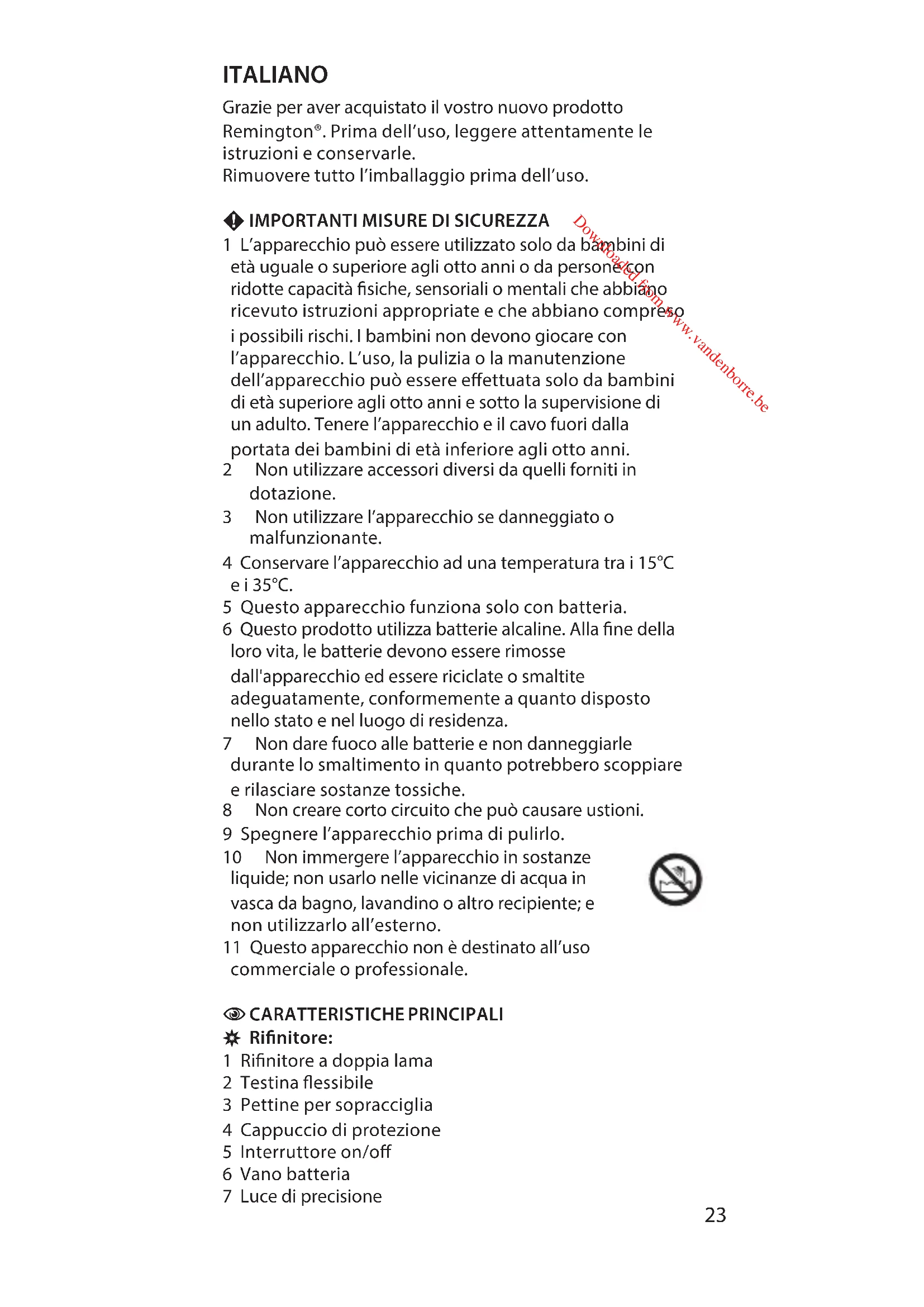 Downloaded from www.vandenborre.beGrazieperaveracquistatoilvostronuovoprodotto Remington®. Prima dell’uso, leggere attentamente le istruzioni e conservarle. Rimuovere tutto l’imballaggio prima dell’uso.