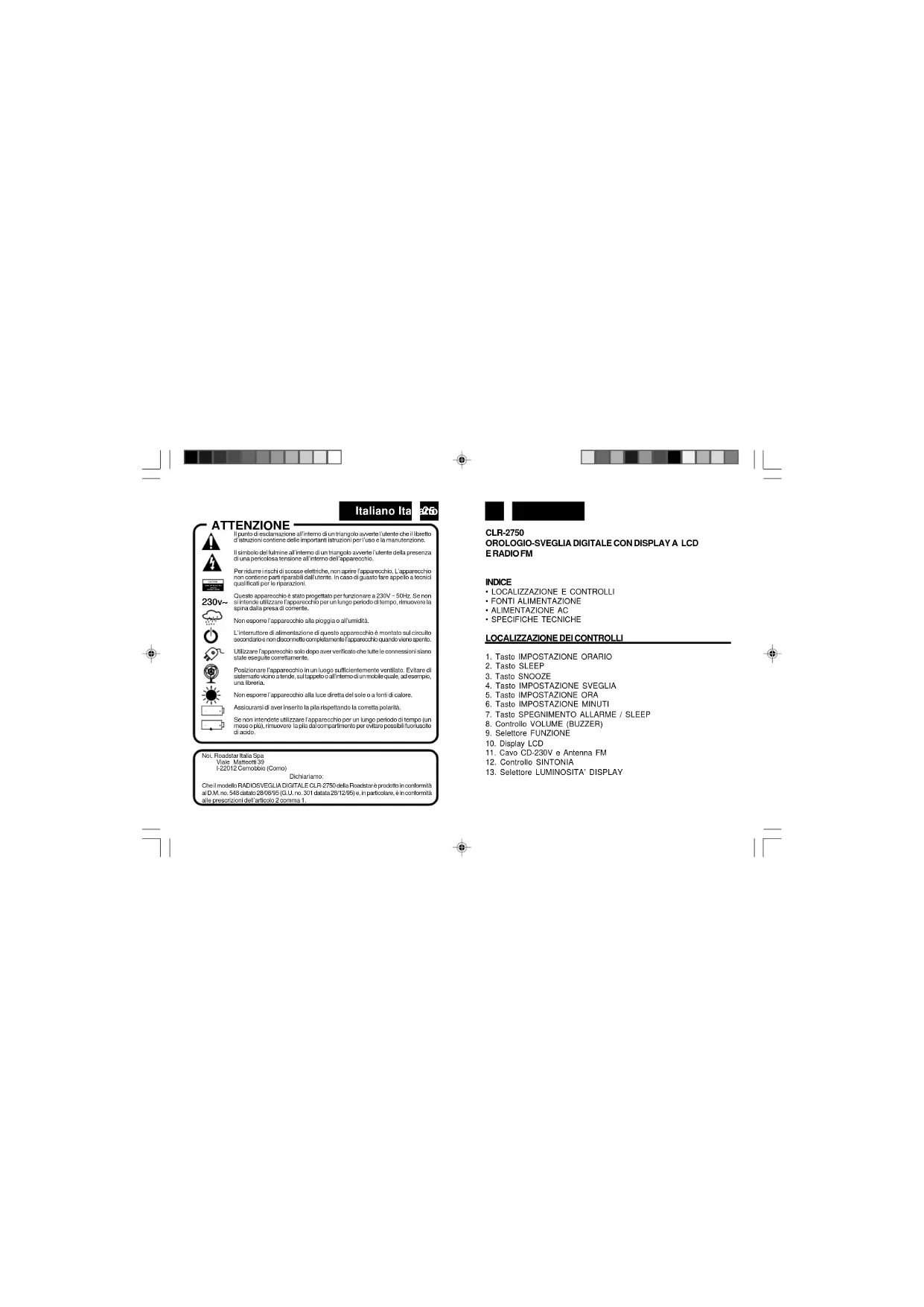 ATTENZIONE Il punto di esclamazione all’interno di un triangolo avverte l’utente che il librettod’istruzioni contiene delle importanti istruzioni per l’uso e la manutenzione.Il simbolo del fulmine all’interno di un triangolo avverte l’utente della presenzadi una pericolosa tensione all’interno dell’apparecchio.Per ridurre i rischi di scosse elettriche, non aprire l’apparecchio. L’apparecchionon contiene parti riparabili dall’utente. In caso di guasto fare appello a tecniciqualificati per le riparazioni.Questo apparecchio è stato progettato per funzionare a 230V ~ 50Hz. Se nonsi intende utilizzare l’apparecchio per un lungo periodo di tempo, rimuovere laspina dalla presa di corrente.Non esporre l’apparecchio alla pioggia o all’umidità.L’interruttore di alimentazione di questo apparecchio è montato sul circuitosecondario e non disconnette completamente l’apparecchio quando viene spento.Utilizzare l’apparecchio solo dopo aver verificato che tutte le connessioni sianostate eseguite correttamente.Posizionare l’apparecchio in un luogo sufficientemente ventilato. Evitare disistemarlo vicino a tende, sul tappeto o all’interno di un mobile quale, ad esempio,una libreria.Non esporre l’apparecchio alla luce diretta del sole o a fonti di calore.Assicurarsi di aver inserito la pila rispettando la corretta polarità.Se non intendete utilizzare l’apparecchio per un lungo periodo di tempo (unmese o più), rimuovere la pila dal compartimento per evitare possibili fuoriuscitedi acido.CAUTIONRISK OF ELECTRICSHOCKDO NOT OPEN 230v~ - +- +Noi. Roadstar Italia SpaViale Matteotti 39I-22012 Cernobbio (Como)Dichiariamo:Che il modello RADIOSVEGLIA DIGITALE CLR-2750 della Roadstar è prodotto in conformitàal D.M. no. 548 datato 28/08/95 (G.U. no. 301 datata 28/12/95) e, in particolare, è in conformitàalle prescrizioni dell’articolo 2 comma 1.Italiano Italiano FONTI ALIMENTAZIONE Questo apparecchio funziona con una fonte di alimentazione di 230V ~ 50Hz. Collegare il cavo alimentazione AC alla presa di corrente AC domestica. Assicurarsi che il voltaggio sia uguale a quello riportato sulla targa dei dati caratteristici posizionata sul retro dell'apparecchio. Batterie di Protezione contro un’interruzione elettrica La radio possiede un circuito di batterie di riserva che mantiene l'orario corretto e le impostazioni della sveglia se si verifica un'interruzione temporanea della corrente elettrica. Installare una batteria di 9 volt (tipo 6F 22/006P), non inclusa, nel compartimento batteria posizionato sulla parte bassa dell'apparecchio. Nota: raccomandiamo l'utilizzo di una batteria alcalina perché durano più a lungo. Cambiare la batteria ogni 9 - 12 mesi per ottenere migliori risultati ed evitare possibili fuoriuscite d'acido dalle batterie. Se la corrente elettrica viene interrotta temporaneamente il display lampeggerà e la radio non funzionerà. Tuttavia, il circuito di batterie di riserva continuerà a mantenere le impostazione dell'orario e della sveglia. Quando verrà ripristinata la corrente elettrica, l'orologio visualizzerà l'orario corretto e l'impostazione della sveglia, e non sarà necessario effettuare ulteriori impostazioni. Nota: Se l'alimentazione viene interrotta e non vi é una batteria nel compartimento o la stessa è scarica. L'orario e le impostazioni della sveglia saranno perse. Quando verrà ripristinata la corrente elettrica l'orologio inizierà a lampeggiare indicando che l'orario e le impostazioni della sveglia dovranno essere corretti. IMPOSTAZIONE DELL'ORARIO