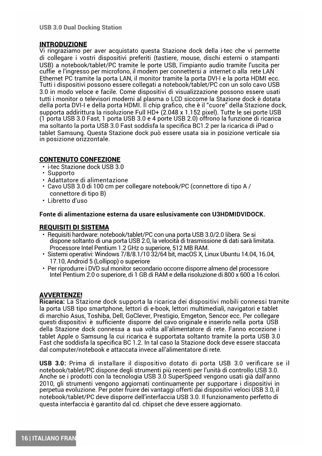 Quick Start ITALIANO I problemi che si riscontrano al momento dell’installazione o dell’uso dei dispositivi USB 3.0 sono causati spesso dagli strumenti per l’unità di controllo USB 3.0 o per il chipset del notebook/tablet/PC non aggiornati. Altri problemi sono causati dalle unità di controllo rmware delle porte USB 3.0 obsolete. Questi ultimi succedono soprattutto usando i dispositivi dei seguenti produttori: Intel, Renesas (già NEC), Via (VLI), AS Media, Fresco Logic o Etron. Gli strumenti aggiornati per i prodotti della i-tec si trovano sulla scheda “Download” del sito web: www.i-tec.cz/it. INSTALLAZIONE DEGLI STRUMENTI NEI SISTEMI OPERATIVI WINDOWS 7/8/8.1/10 (VERSIONE A 32/64 BIT) Prima di usare la Stazione dock per la prima volta non collegarla al notebook/tablet/PC prima di installare i rispettivi strumenti per la porta LAN e per la porta DVI-I. Gli strumenti s’installano soltanto prima del primo uso. Scaricare il software richiesto dalla scheda “Download” del sito web: www.i-tec.cz. Installare gli strumenti rispettando la seguente procedura: Per la porta LAN e per la porta DVI-I avviare il le scaricato, selezionare la lingua dell’installazione e seguire le istruzioni visualizzate sullo schermo. Nota: Installare la porta DVI-I nel sistema operativo Windows 7/8/8.1/10 come “Amministratore”. Lo schermo può lampeggiare nel corso dell’installazione degli strumenti, ma è un fenomeno normale. Finita l’installazione, si consiglia di riavviare il notebook/tablet/PC. INSTALLAZIONE DELL’HARDWARE (COLLEGAMENTO DELLA STAZIONE DOCK AL NOTEBOOK/TABLET/PC)