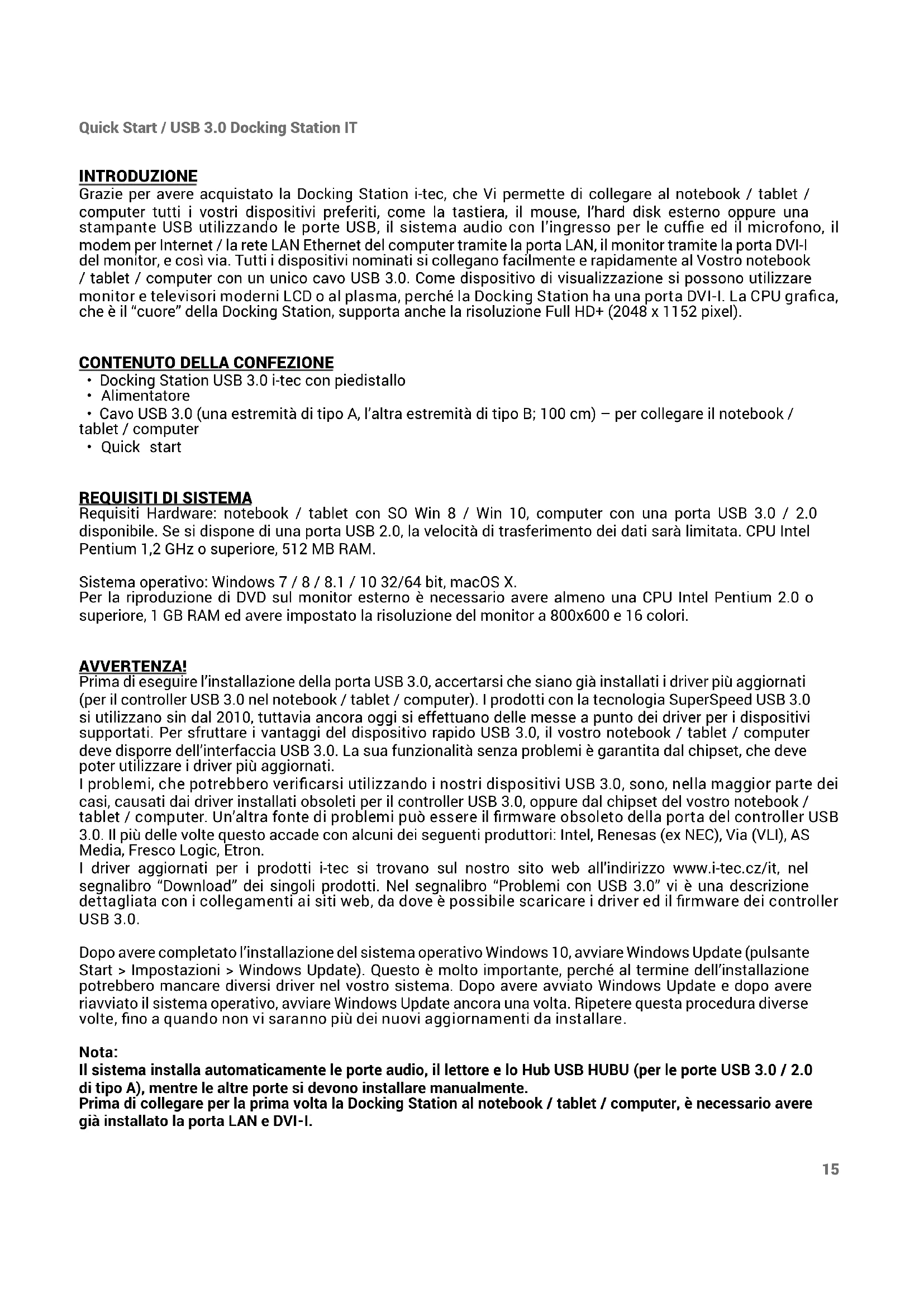 Requisiti Hardware: notebook / tablet con SO Win 8 / Win 10, computer con una porta USB 3.0 / 2.0 disponibile. Se si dispone di una porta USB 2.0, la velocità di trasferimento dei dati sarà limitata. CPU Intel Pentium 1,2 GHz o superiore, 512 MB RAM. Sistema operativo: Windows 7 / 8 / 8.1 / 10 32/64 bit, macOS X. Per la riproduzione di DVD sul monitor esterno è necessario avere almeno una CPU Intel Pentium 2.0 o superiore, 1 GB RAM ed avere impostato la risoluzione del monitor a 800x600 e 16 colori. AVVERTENZA! Prima di eseguire l’installazione della porta USB 3.0, accertarsi che siano già installati i driver più aggiornati (per il controller USB 3.0 nel notebook / tablet / computer). I prodotti con la tecnologia SuperSpeed USB 3.0 si utilizzano sin dal 2010, tuttavia ancora oggi si effettuano delle messe a punto dei driver per i dispositivi supportati. Per sfruttare i vantaggi del dispositivo rapido USB 3.0, il vostro notebook / tablet / computer deve disporre dell’interfaccia USB 3.0. La sua funzionalità senza problemi è garantita dal chipset, che deve poter utilizzare i driver più aggiornati. I problemi, che potrebbero verificarsi utilizzando i nostri dispositivi USB 3.0, sono, nella maggior parte dei casi, causati dai driver installati obsoleti per il controller USB 3.0, oppure dal chipset del vostro notebook / tablet / computer. Un’altra fonte di problemi può essere il firmware obsoleto della porta del controller USB 3.0. Il più delle volte questo accade con alcuni dei seguenti produttori: Intel, Renesas (ex NEC), Via (VLI), AS Media, Fresco Logic, Etron. I driver aggiornati per i prodotti i-tec si trovano sul nostro sito web all’indirizzo www.i-tec.cz/it, nel segnalibro “Download” dei singoli prodotti. Nel segnalibro “Problemi con USB 3.0” vi è una descrizione dettagliata con i collegamenti ai siti web, da dove è possibile scaricare i driver ed il firmware dei controller USB 3.0. Dopo avere completato l’installazione del sistema operativo Windows 10, avviare Windows Update (pulsante Start > Impostazioni > Windows Update). Questo è molto importante, perché al termine dell’installazione potrebbero mancare diversi driver nel vostro sistema. Dopo avere avviato Windows Update e dopo avere riavviato il sistema operativo, avviare Windows Update ancora una volta. Ripetere questa procedura diverse volte, fino a quando non vi saranno più dei nuovi aggiornamenti da installare. Nota: Il sistema installa automaticamente le porte audio, il lettore e lo Hub USB HUBU (per le porte USB 3.0 / 2.0 di tipo A), mentre le altre porte si devono installare manualmente. Prima di collegare per la prima volta la Docking Station al notebook / tablet / computer, è necessario avere già installato la porta LAN e DVI-I.16 Quick Start / USB 3.0 Docking StationIT INSTALLAZIONE DEI DRIVER IN WINDOWS 7 / 8 / 8.1 / 10 (VERSIONI 32/64 BIT) Non collegare la Docking Station al notebook / tablet / computer, fino a quando non saranno già installati i driver pertinenti per le porte LAN e DVI-I. Si devono installare i driver dei dispositivi soltanto prima del primo utilizzo. Scaricare il software richiesto dal nostro sito web dall’indirizzo www.i-tec.cz/it dal segnalibro “Download” del prodotto pertinente. Installare i driver secondo la seguente procedura: Per la porta LAN e DVI-I, avviare il file scaricato, selezionare la lingua di installazione e proseguire secondo le istruzioni sullo schermo. Nota: In Windows 7 / 8 / 8.1 / 10, installare la porta DVI-I come utente “Administrator” (Amministratore). Lo schermo, durante la procedura di installazione, potrebbe lampeggiare, il che è normale. Al termine dell’installazione, si consiglia di riavviare il notebook / tablet / computer. INSTALLAZIONE DELL’HARDWARE (COLLEGAMENTO DELLA DOCKING STATION AL NOTEBOOK / TABLET / COMPUTER)