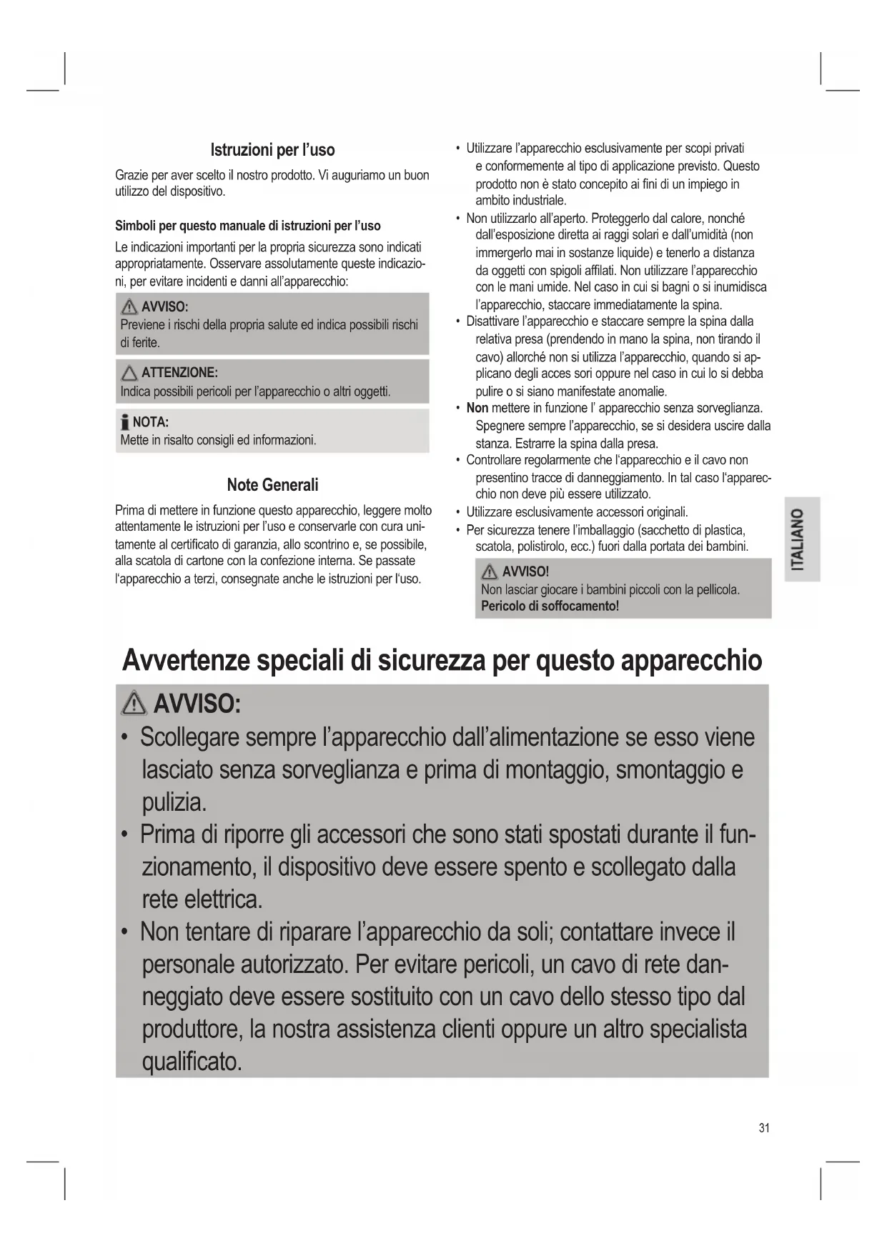- Per sicurezza tenere l’imballaggio (sacchetto di plastica, scatola, polistirolo, ecc.) fuori dalla portata dei bambini. AVVISO! Non lasciar giocare i bambini piccoli con la pellicola. Pericolo di soffocamento! Avvertenze speciali di sicurezza per questo apparecchio AVVISO: