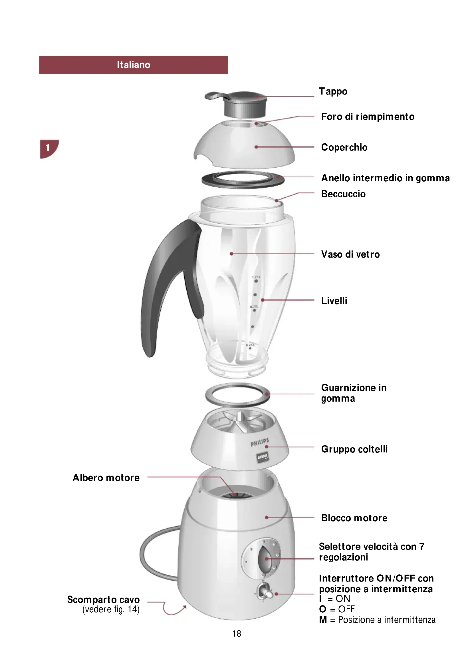 Tappo Foro di riempimento Coperchio Anello intermedio in gomma Beccuccio Vaso di vetro Livelli Guarnizione in gomma Gruppo coltelli PHILIPS Albero motore Blocco motore Selettore velocità con 7 regolazioni Interruttore ON/OFF con posizione a intermittenza I = ON O = OFF M = Posizione a intermittenza Scomparto cavo (vedere fig. 14)Philips e Alessi hanno unito i loro sforzi per creare una linea esclusiva di piccoli elettrodomestici per la cucina, che offrono il meglio in quanto a design e funzionalità. Questo prodotto è nato per celebrare il successo della linea Philips Alessi che consiste in un tostapane, una macchina per il caffè, un bollitore e uno spremiagrumi.