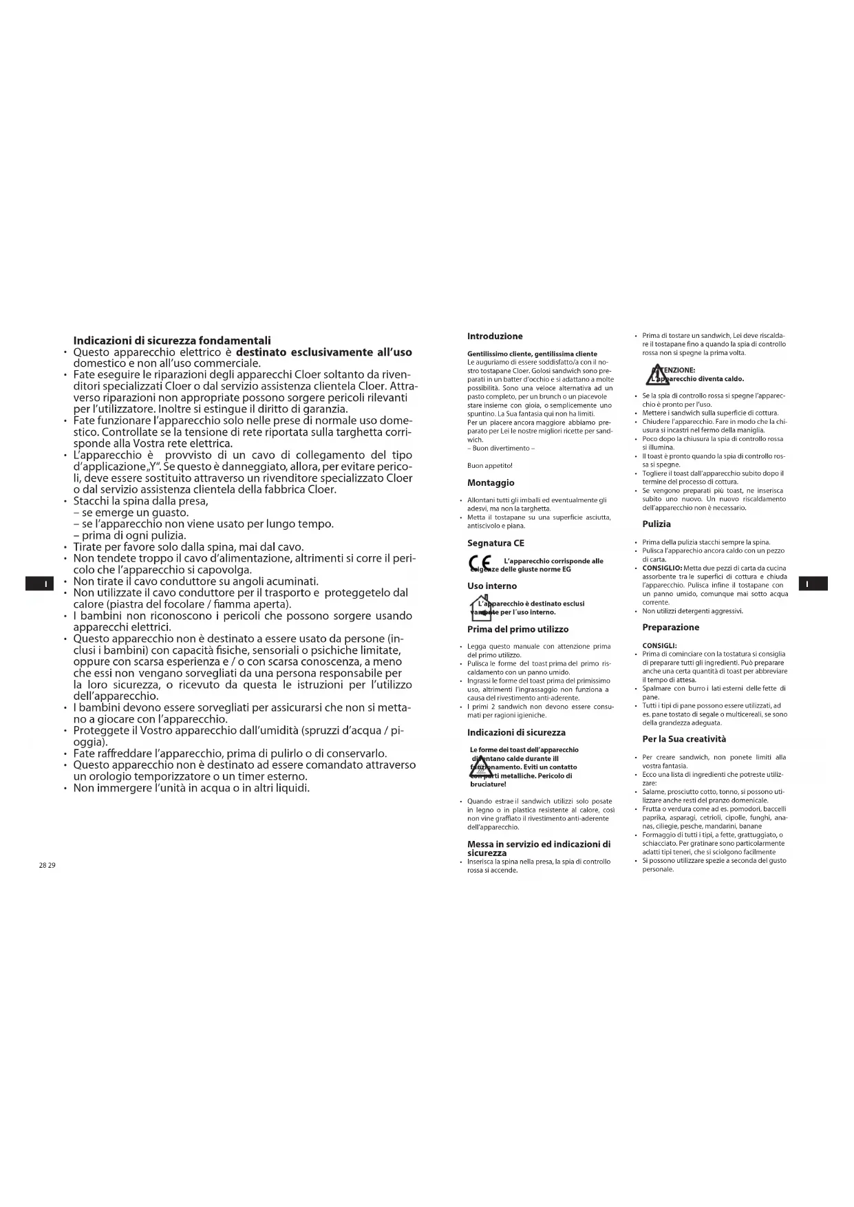 Introduzione Gentilissimo cliente, gentilissima cliente Le auguriamo di essere soddisfatto/a con il no- stro tostapane Cloer. Golosi sandwich sono pre- parati in un batter d’occhio e si adattano a molte possibilità. Sono una veloce alternativa ad un pasto completo, per un brunch o un piacevole stare insieme con gioia, o semplicemente uno spuntino. La Sua fantasia qui non ha limiti. Per un piacere ancora maggiore abbiamo pre- parato per Lei le nostre migliori ricette per sand- wich. – Buon divertimento – Buon appetito! Montaggio Allontani tutti gli imballi ed eventualmente gli adesvi, ma non la targhetta. Metta il tostapane su una superficie asciutta, antiscivolo e piana. Segnatura CE L’apparecchio corrisponde alle esigenze delle giuste norme EG Uso interno L’apparecchio è destinato esclusi vamente per l´uso interno. Prima del primo utilizzo Legga questo manuale con attenzione prima del primo utilizzo. Pulisca le forme del toast prima del primo ris- caldamento con un panno umido. Ingrassi le forme del toast prima del primissimo uso, altrimenti l’ingrassaggio non funziona a causa del rivestimento anti-aderente. I primi 2 sandwich non devono essere consu- mati per ragioni igieniche. Indicazioni di sicurezza Le forme dei toast dell’apparecchio diventano calde durante ill funzionamento. Eviti un contatto con parti metalliche. Pericolo di bruciature! Quando estrae il sandwich utilizzi solo posate in legno o in plastica resistente al calore, così non vine graffiato il rivestimento anti-aderente dell’apparecchio. Messa in servizio ed indicazioni di sicurezza Inserisca la spina nella presa, la spia di controllo rossa si accende. Prima di tostare un sandwich, Lei deve riscalda- re il tostapane fino a quando la spia di controllo rossa non si spegne la prima volta. ATTENZIONE: L’apparecchio diventa caldo. Se la spia di controllo rossa si spegne l’apparec- chio è pronto per l’uso. Mettere i sandwich sulla superficie di cottura. Chiudere l’apparecchio. Fare in modo che la chi- usura si incastri nel fermo della maniglia. Poco dopo la chiusura la spia di controllo rossa si illumina. Il toast è pronto quando la spia di controllo ros- sa si spegne. Togliere il toast dall’apparecchio subito dopo il termine del processo di cottura. Se vengono preparati più toast, ne inserisca subito uno nuovo. Un nuovo riscaldamento dell’apparecchio non è necessario. Pulizia Prima della pulizia stacchi sempre la spina. Pulisca l’apparechio ancora caldo con un pezzo di carta. CONSIGLIO: Metta due pezzi di carta da cucina assorbente tra le superfici di cottura e chiuda l’apparecchio. Pulisca infine il tostapane con un panno umido, comunque mai sotto acqua corrente. Non utilizzi detergenti aggressivi. Preparazione CONSIGLI: Prima di cominciare con la tostatura si consiglia di preparare tutti gli ingredienti. Può preparare anche una certa quantità di toast per abbreviare il tempo di attesa. Spalmare con burro i lati esterni delle fette di pane. Tutti i tipi di pane possono essere utilizzati, ad es. pane tostato di segale o multicereali, se sono della grandezza adeguata. Per la Sua creatività Per creare sandwich, non ponete limiti alla vostra fantasia. Ecco una lista di ingredienti che potreste utiliz- zare: Salame, prosciutto cotto, tonno, si possono uti- lizzare anche resti del pranzo domenicale. Frutta o verdura come ad es. pomodori, baccelli paprika, asparagi, cetrioli, cipolle, funghi, ana- nas, ciliegie, pesche, mandarini, banane Formaggio di tutti i tipi, a fette, grattuggiato, o schiacciato. Per gratinare sono particolarmente adatti tipi teneri, che si sciolgono facilmente Si possono utilizzare spezie a seconda del gusto personale.