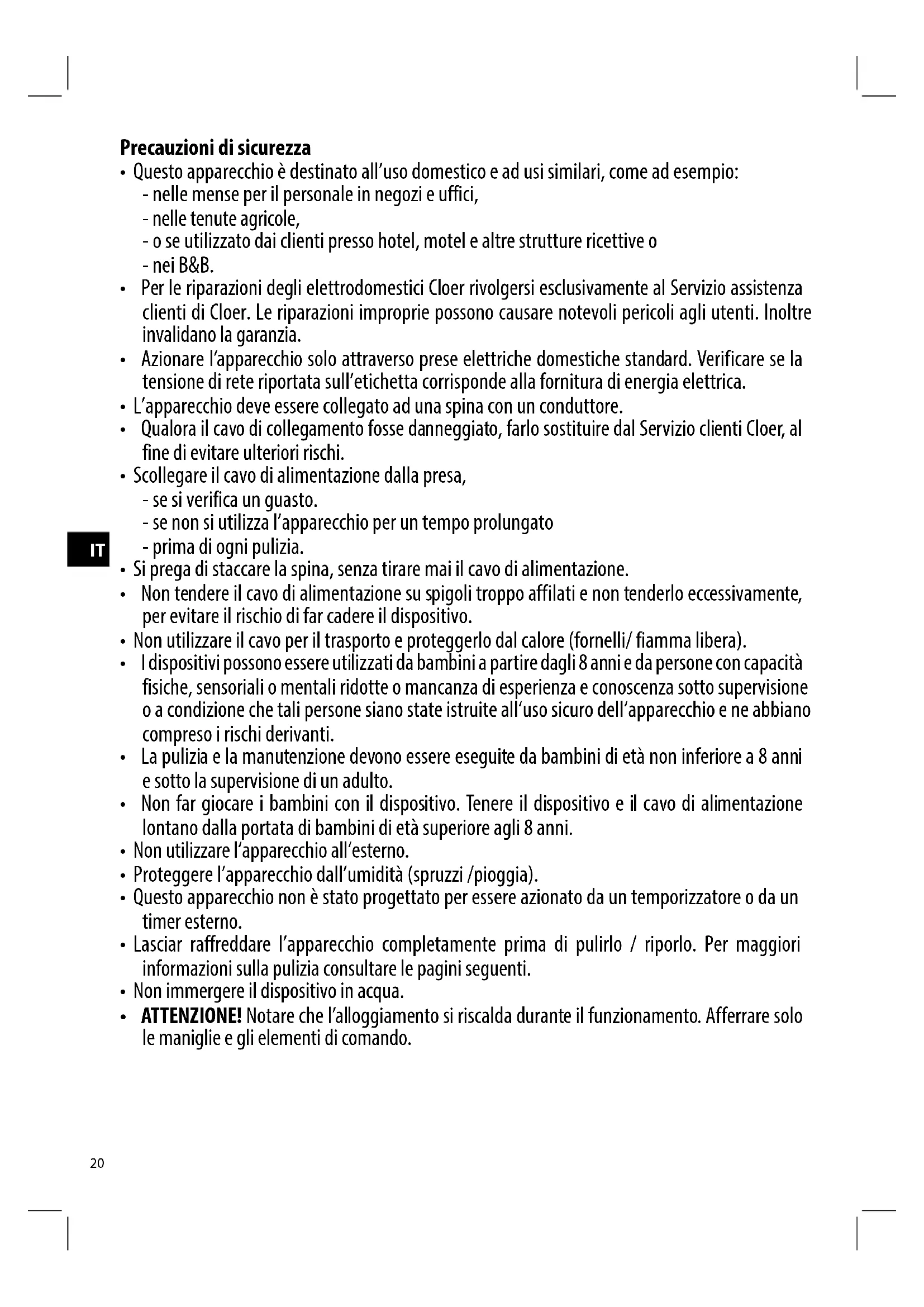 - Qualora il cavo di collegamento fosse danneggiato, farlo sostituire dal Servizio clienti Cloer, al fine di evitare ulteriori rischi.