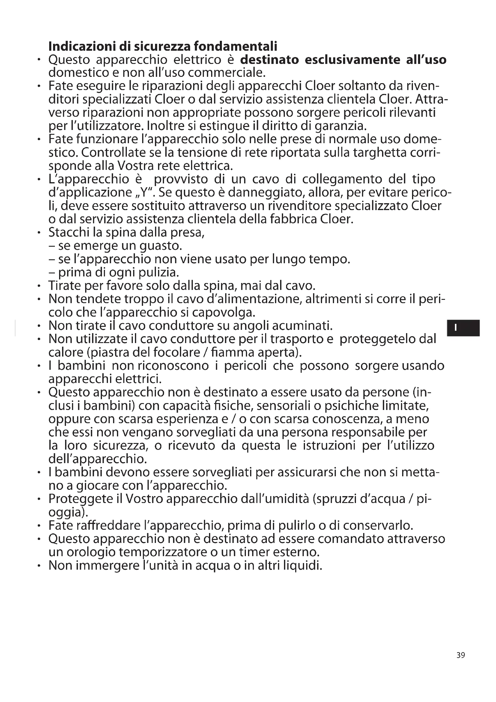 - 39 Indicazioni di sicurezza fondamentali Questo apparecchio elettrico è destinato esclusivamente all’uso domestico e non all’uso commerciale. Fate eseguire le riparazioni degli apparecchi Cloer soltanto da riven- ditori specializzati Cloer o dal servizio assistenza clientela Cloer. Attra- verso riparazioni non appropriate possono sorgere pericoli rilevanti per l’utilizzatore. Inoltre si estingue il diritto di garanzia. Fate funzionare l’apparecchio solo nelle prese di normale uso dome- stico. Controllate se la tensione di rete riportata sulla targhetta corri- sponde alla Vostra rete elettrica. L’apparecchio è provvisto di un cavo di collegamento del tipo d’applicazione „Y“. Se questo è danneggiato, allora, per evitare perico- li, deve essere sostituito attraverso un rivenditore specializzato Cloer o dal servizio assistenza clientela della fabbrica Cloer. Stacchi la spina dalla presa, – se emerge un guasto. – se l’apparecchio non viene usato per lungo tempo. – prima di ogni pulizia. Tirate per favore solo dalla spina, mai dal cavo. Non tendete troppo il cavo d’alimentazione, altrimenti si corre il peri- colo che l’apparecchio si capovolga. Non tirate il cavo conduttore su angoli acuminati. Non utilizzate il cavo conduttore per il trasporto e proteggetelo dal calore (piastra del focolare / amma aperta). I bambini non riconoscono i pericoli che possono sorgere usando apparecchi elettrici. Questo apparecchio non è destinato a essere usato da persone (in- clusi i bambini) con capacità siche, sensoriali o psichiche limitate, oppure con scarsa esperienza e / o con scarsa conoscenza, a meno che essi non vengano sorvegliati da una persona responsabile per la loro sicurezza, o ricevuto da questa le istruzioni per l’utilizzo dell’apparecchio. I bambini devono essere sorvegliati per assicurarsi che non si metta- no a giocare con l’apparecchio. Proteggete il Vostro apparecchio dall’umidità (spruzzi d’acqua / pi- oggia). Fate rareddare l’apparecchio, prima di pulirlo o di conservarlo. Questo apparecchio non è destinato ad essere comandato attraverso un orologio temporizzatore o un timer esterno. Non immergere l‘unità in acqua o in altri liquidi.