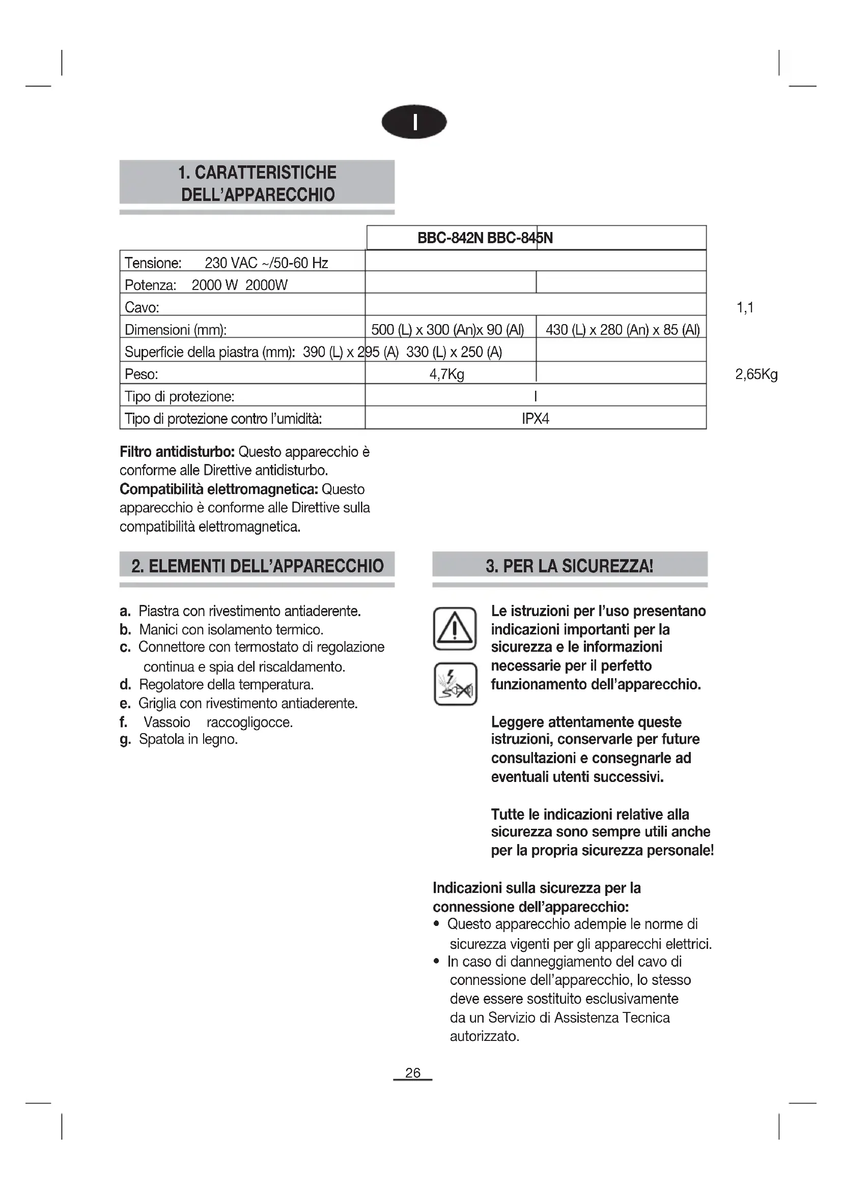 Filtro antidisturbo: Questo apparecchio è conforme alle Direttive antidisturbo. Compatibilità elettromagnetica: Questo apparecchio è conforme alle Direttive sulla compatibilità elettromagnetica. a. Piastra con rivestimento antiaderente. b. Manici con isolamento termico. c. Connettore con termostato di regolazione continua e spia del riscaldamento. d. Regolatore della temperatura. e. Griglia con rivestimento antiaderente. f. Vassoio raccogligocce. g. Spatola in legno.