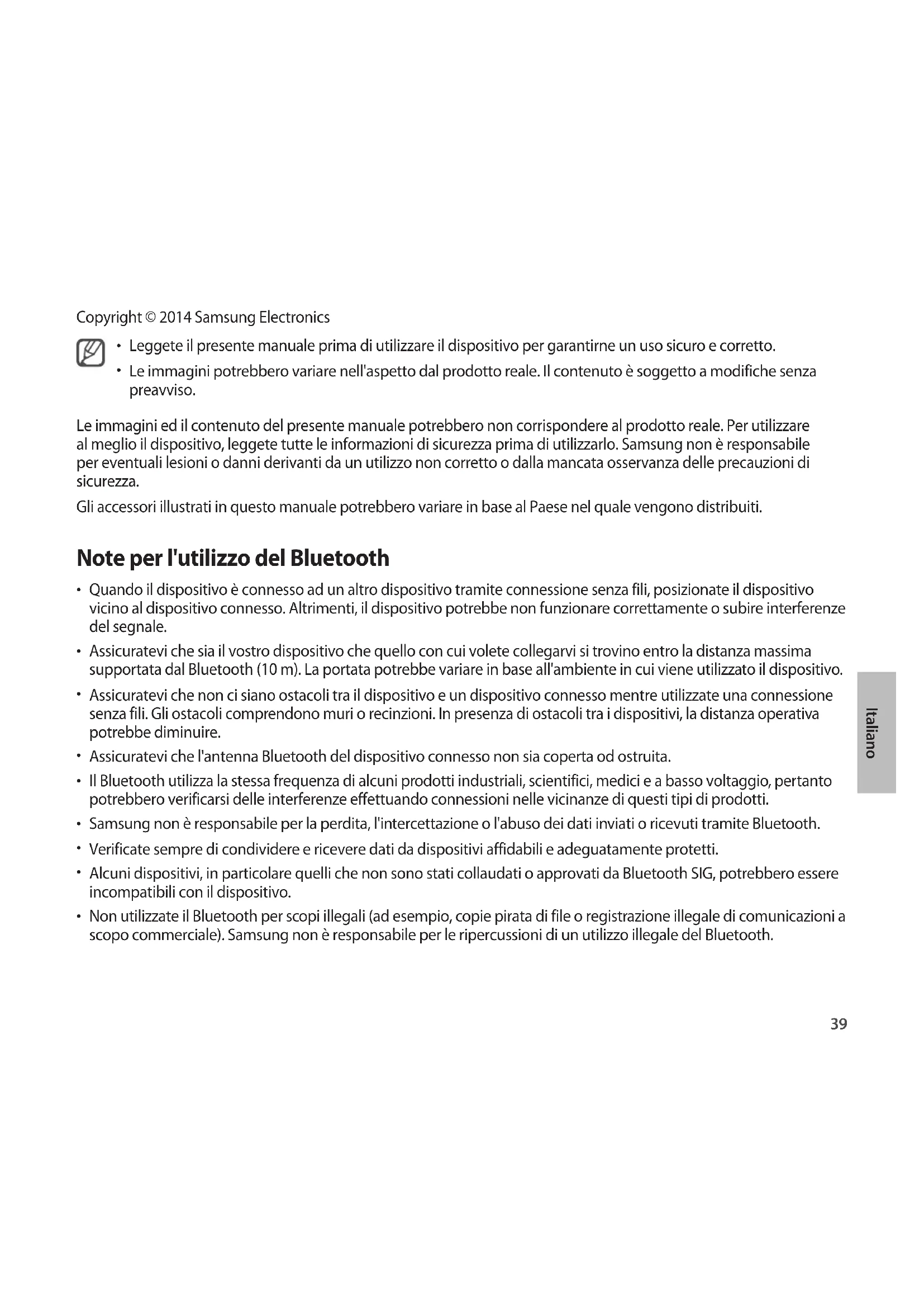 Le immagini potrebbero variare nell'aspetto dal prodotto reale. Il contenuto è soggetto a modifiche senza preavviso. Le immagini ed il contenuto del presente manuale potrebbero non corrispondere al prodotto reale. Per utilizzare al meglio il dispositivo, leggete tutte le informazioni di sicurezza prima di utilizzarlo. Samsung non è responsabile per eventuali lesioni o danni derivanti da un utilizzo non corretto o dalla mancata osservanza delle precauzioni di sicurezza. Gli accessori illustrati in questo manuale potrebbero variare in base al Paese nel quale vengono distribuiti. Note per l'utilizzo del Bluetooth